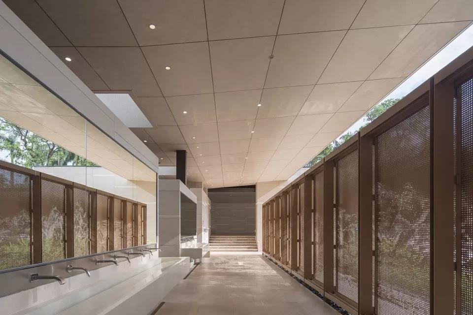 公廁主體較西側廣場標高下沉600-900mm,使其建筑體量于廣場一側獲得宜人尺度,通過吊頂與廁格的空隙將東側山林的綠意滲透進來,建筑以謙虛的姿態融入環境之中,成為自然的一部分。同時長廊與衛生間之間的高差也將公共區域與相對私密的男女廁所區域顯著區分出來,起到提示作用。