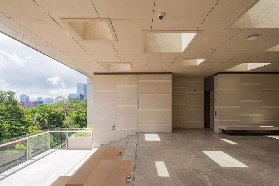 ▼東側在母嬰室和家庭衛生間門口設置休閑臺階等候區及觀景平臺,東側郁郁蔥蔥的山林與鱗次櫛比的城市遠景盡收眼底