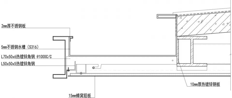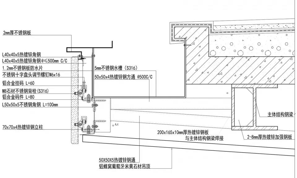 衛生間檐口:以石材蜂窩板與檐口石材共同組成具有雕塑感的建筑檐口,石材蜂窩板吊頂與石材墻面渾然一體,仿佛整石雕琢而成。