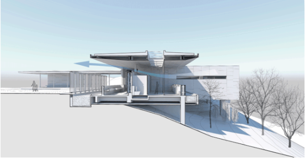 休息長廊檐口:以陽極氧化鋁形成略帶反射、平整光潔的吊頂面,營造出微妙的光影效果和活潑生動的公共場所氛圍。