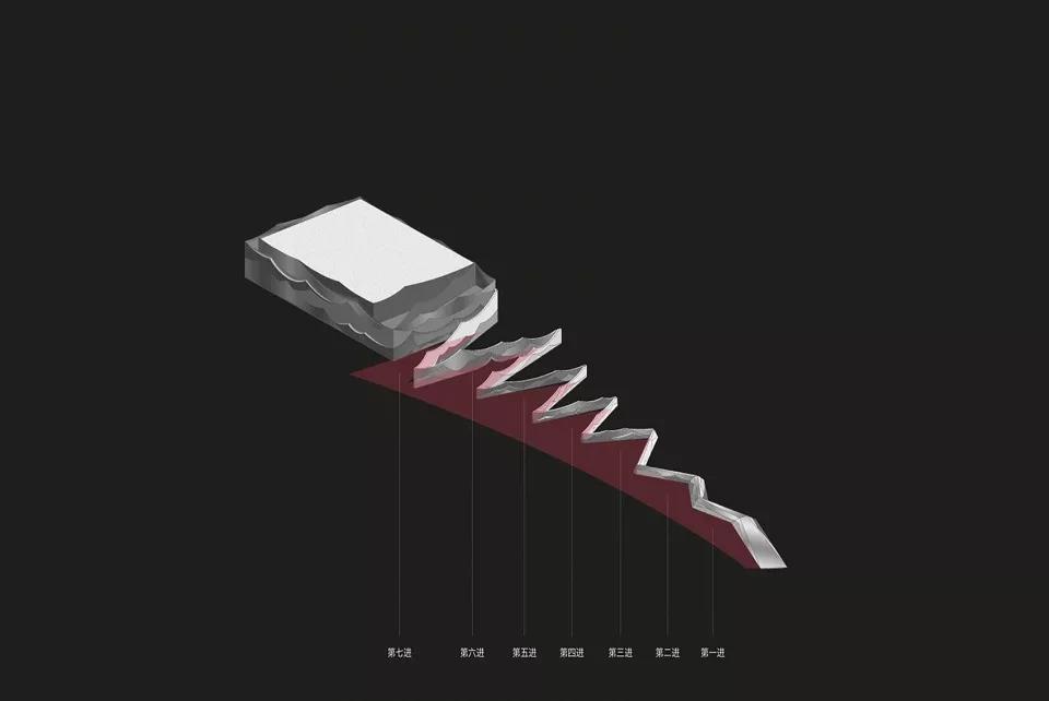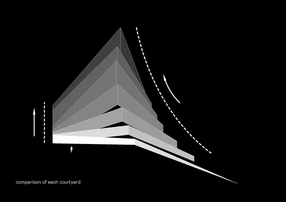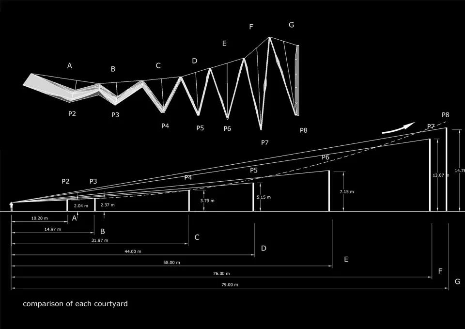 ▼每兩個隔墻之間的夾角伴隨著墻體的升高逐漸縮小,空間由寬闊到逼仄
