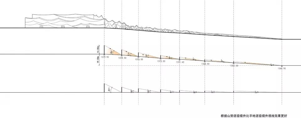 ▼折墻高度在中段突然增高,在道路邊觀看時形成節奏由緩漸急的視覺曲線