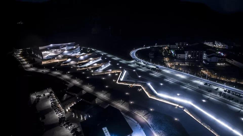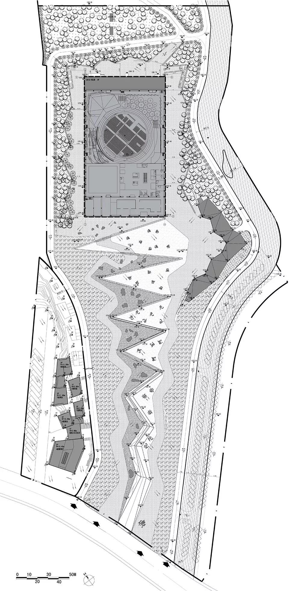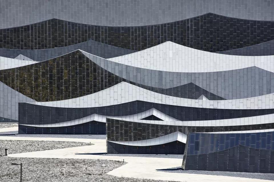 ”經折“和劇場均采用了不同材質的表皮,包括石材、玻璃和不銹鋼等材料。通過這些材料的反光和透射的特點,體量被化解為不同尺度的起伏的圖案,不同程度地影照著周圍的景象,藍天、白云、山巒、樹木,也包括身處其間的觀眾,一切盡在似有與似無之間,極大地消解著建筑物的輪廓線,破解建筑體量對周圍環境的壓力。