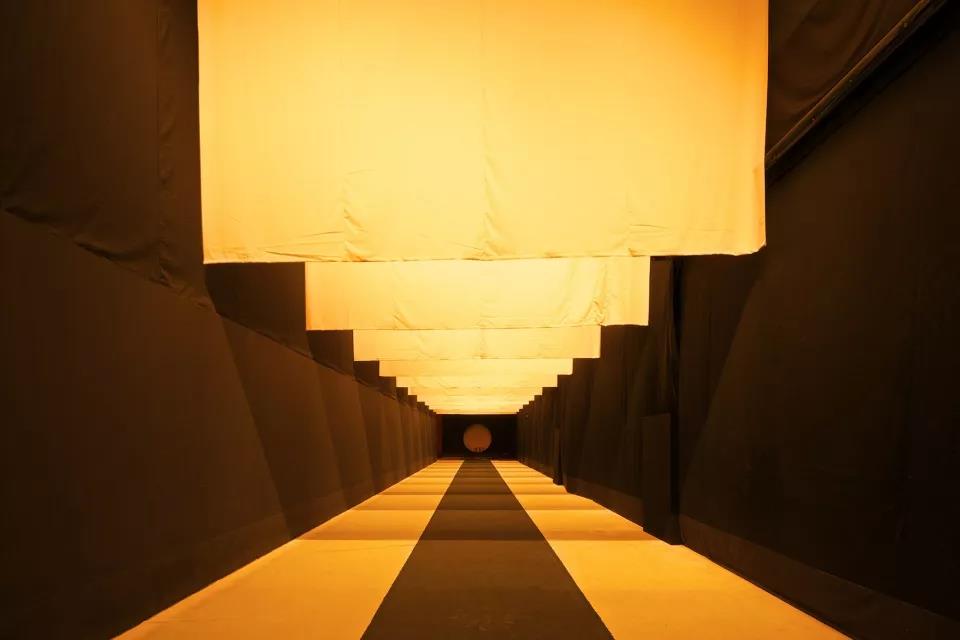 在一場場跌宕起伏的“經折”之間,觀眾可以駐足凝思,展開自己與空間、與情景之間的對話,從而激發出自己的心理體驗和精神感受。場地當中一石、一木的光影變幻,記錄著時間的過往、生命的輪回,讓人拋棄世間的雜念,開闊眼界和胸襟,感知佛陀的智慧。這不僅帶來感官上的震撼,更多的將引發觀者的思辨。而外延懸掛風鈴,在山谷之間,輕聲回蕩,猶如佛音傳唱。