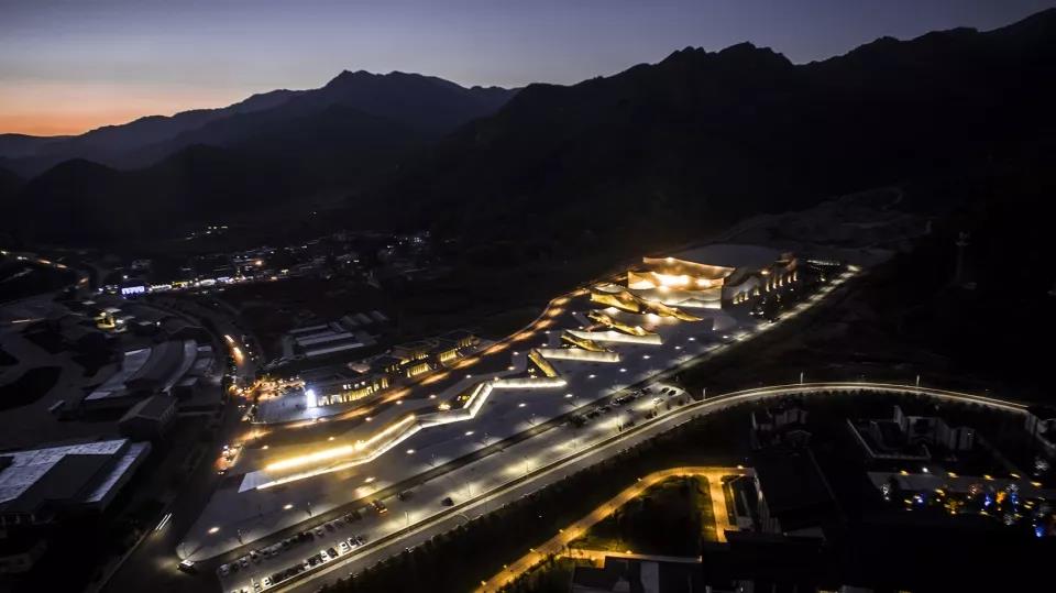 “又見五臺山”劇場位于五臺山景區南入口外、兩座小山前的開闊場地上。由于大型情景演出的需要,劇場空間是一個長131米、寬75米、高21.5米的大空間。
