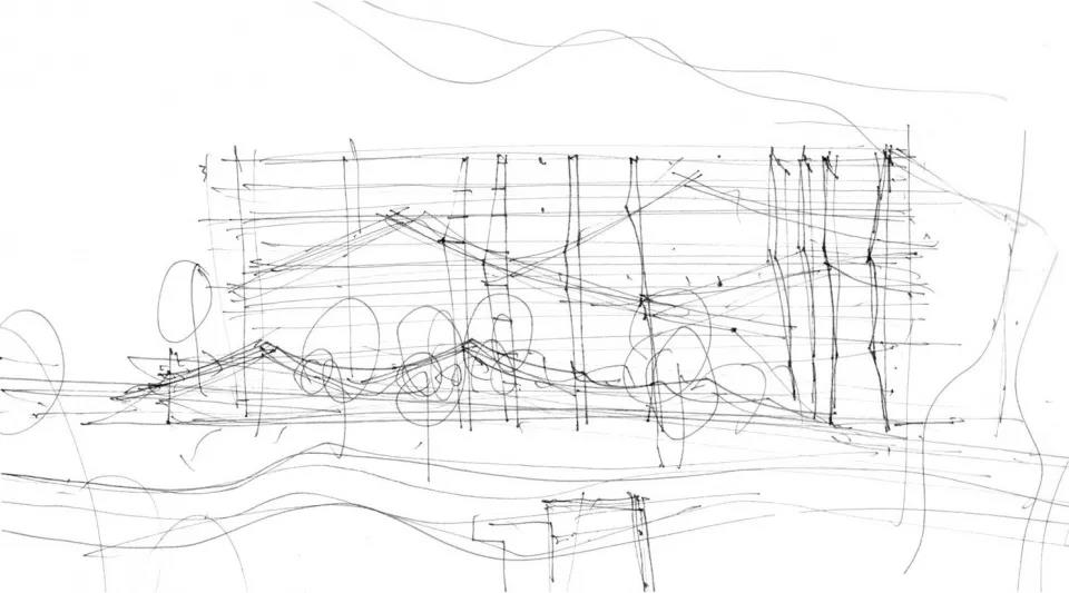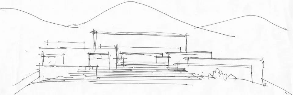 ▼概念草圖 – 在劇場前的空地加入墻體,形成層次層疊的空間序列,消減劇場的大體量