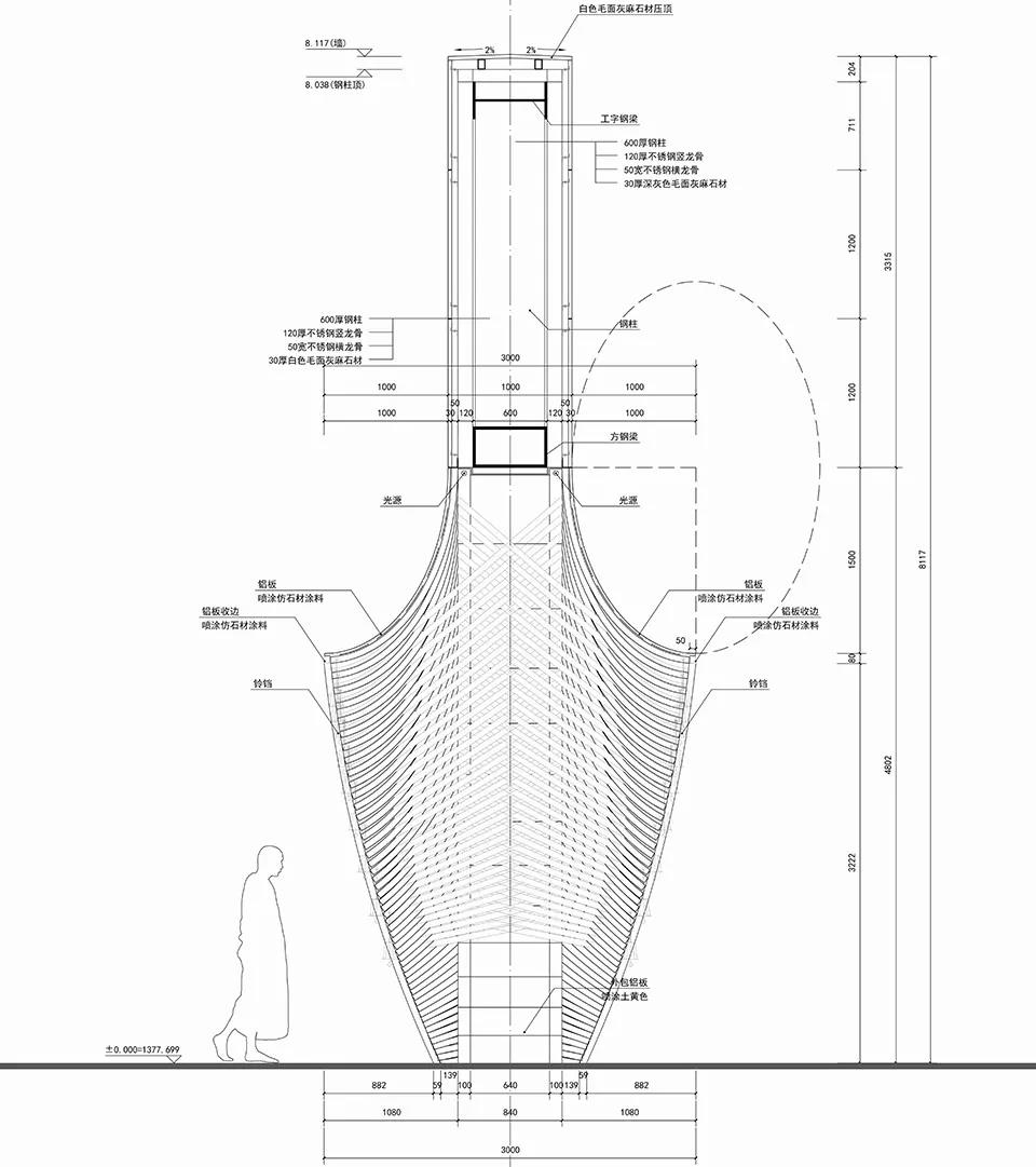 ”經折“被”掀起“的部分,形成游人穿越的通道,呈現出的是中國傳統木構建筑的細部構建,隱喻著建筑所處的人文環境。
