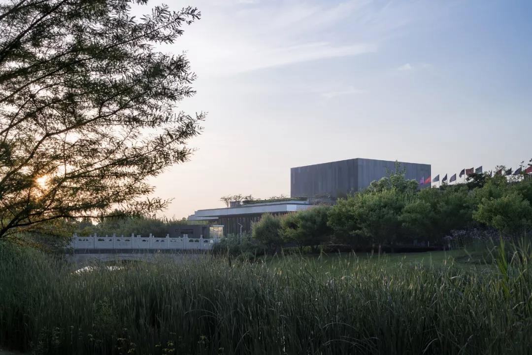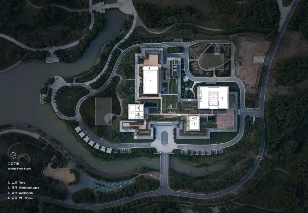 建筑主要功能集中一層布置(層高7.0m),最大化減少對公園的壓迫感。同時,一層屋頂花園又是被抬高的公園“植被”,既修復(fù)了生態(tài)公園的綠化界面。又是視野極佳的“觀景臺”,提供了優(yōu)美的活動場地。局部凸出的建筑體量(陳列館、展示廳、多功能廳等)退在屋頂花園后,猶如幾個“雕塑”,強(qiáng)調(diào)建筑的“分量”感,也增加了整個建筑的空間層次。