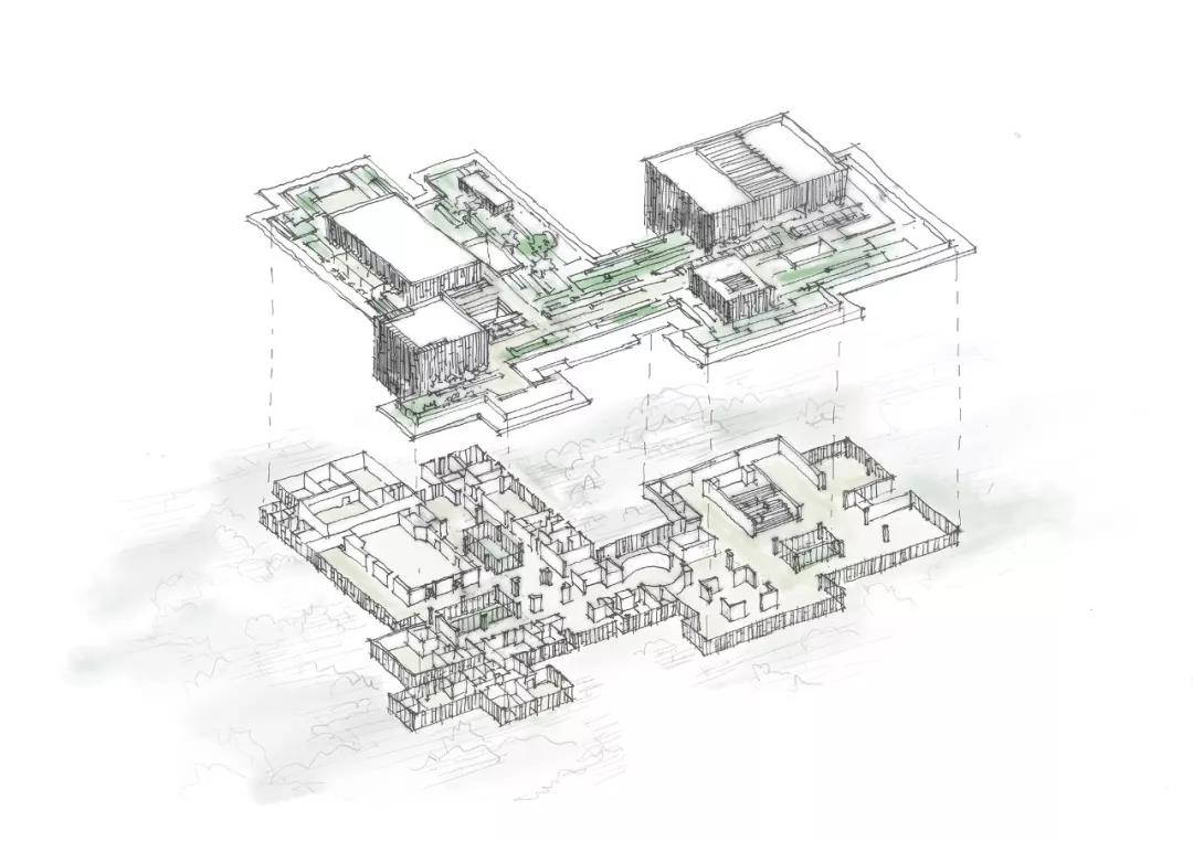依據(jù)場地的空間特質(zhì),辦公區(qū)和陳列館布置在靠近場地的西側(cè)和西南側(cè)。保證了整個場地西側(cè)安靜的空間氛圍,多功能會議區(qū)布置在場地的北側(cè),方便和北側(cè)的室外活動場地相聯(lián)系。展示區(qū)布置在東側(cè),靠近次入口。幾大功能區(qū)塊通過核心的過渡空間——中央大廳貫穿起來,既保證了相互之間的距離又能聯(lián)系成一個整體。