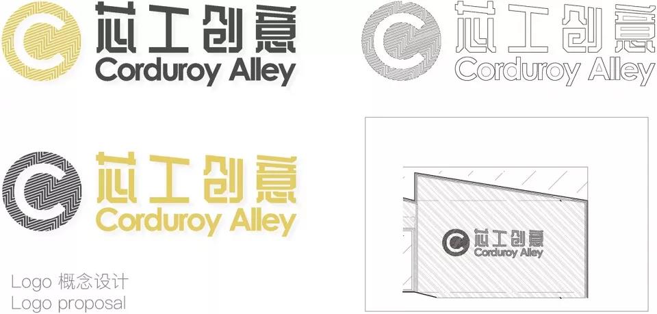 此外,FTA為新生的燈芯絨廠量身定制了案名 – 芯工創意,以及項目的視覺系統,LOGO提取建筑形態中具有高識別度的“斜紋”圖形,使其產品和品牌形象統一,提高項目的識別度。