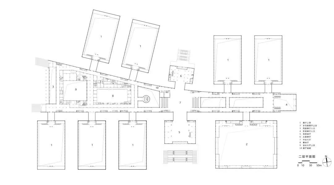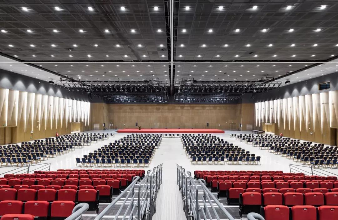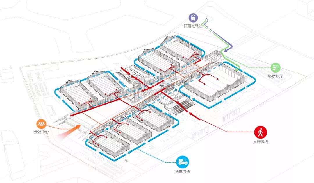 2、靈活高效的功能組合。建筑設置多標高平臺系統(tǒng),供貨線路與人行流線互不交叉。展廳沿樞紐區(qū)魚骨式生長,兩三成組。既能保持整體運營的連貫性,又相對成組團獨立對外經(jīng)營。設置一個相對獨立的2.6萬m2多功能展廳,承擔包括展覽、會議、演藝、賽事等功能。大觀演廳采用無固定坐席布置,后排設置少量活動座椅,可根據(jù)需要分隔成2-4個小廳。約3000m2大宴會廳也可以分隔為3個小廳獨立運營。