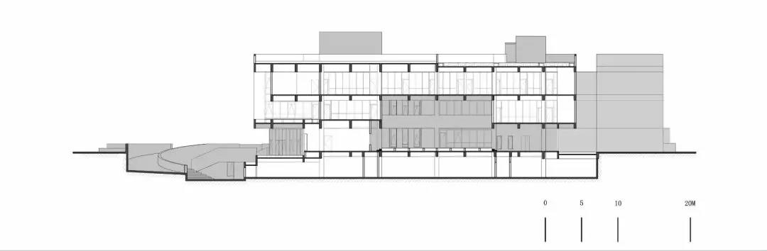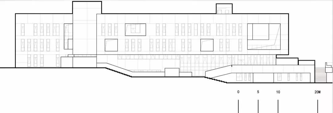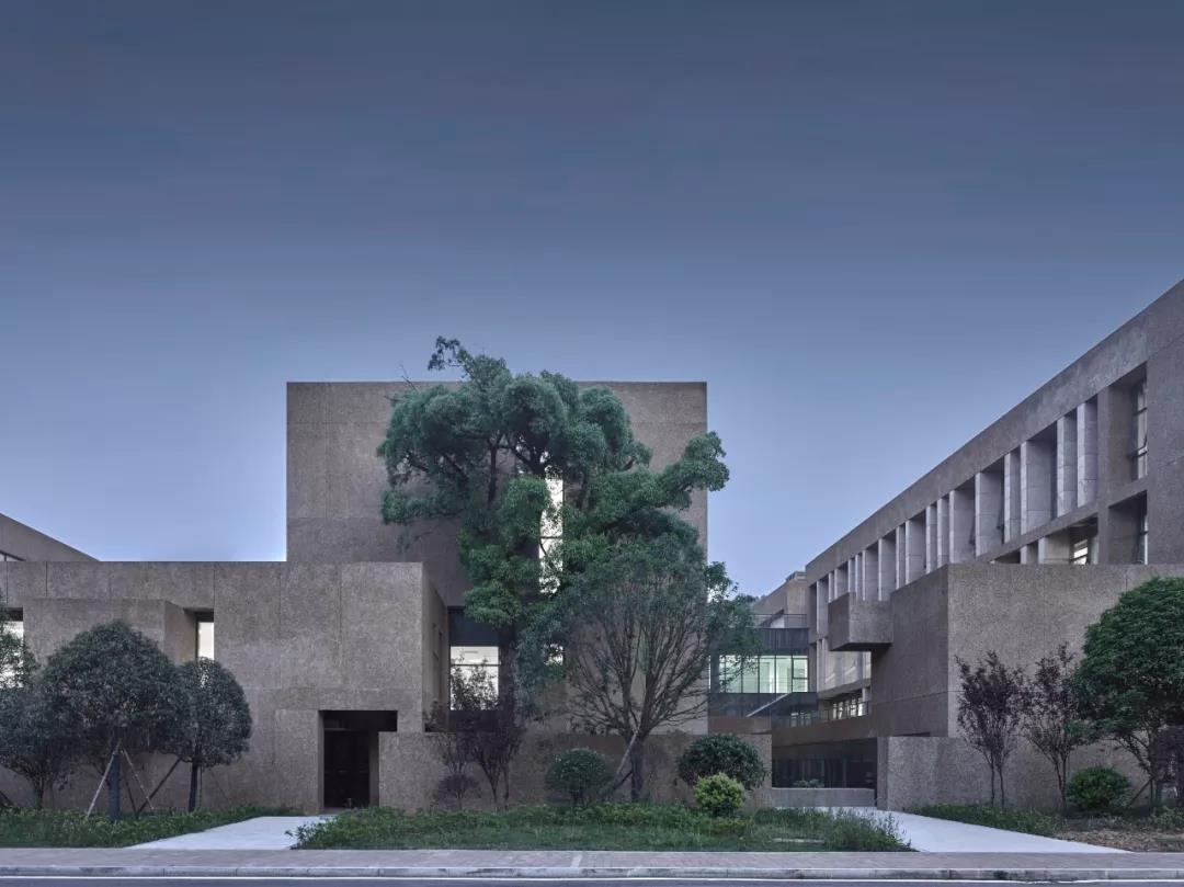 一些局部的處理也繼續強化了校園儀式化的氛圍,例如: 通過狹縫空間雕琢出的線狀天光表達具有未知感的陰影領域;保留原生的兩棵大樹形成局部空間領域的指向中心;一些非理性挑出的實體成為了“布道臺”。