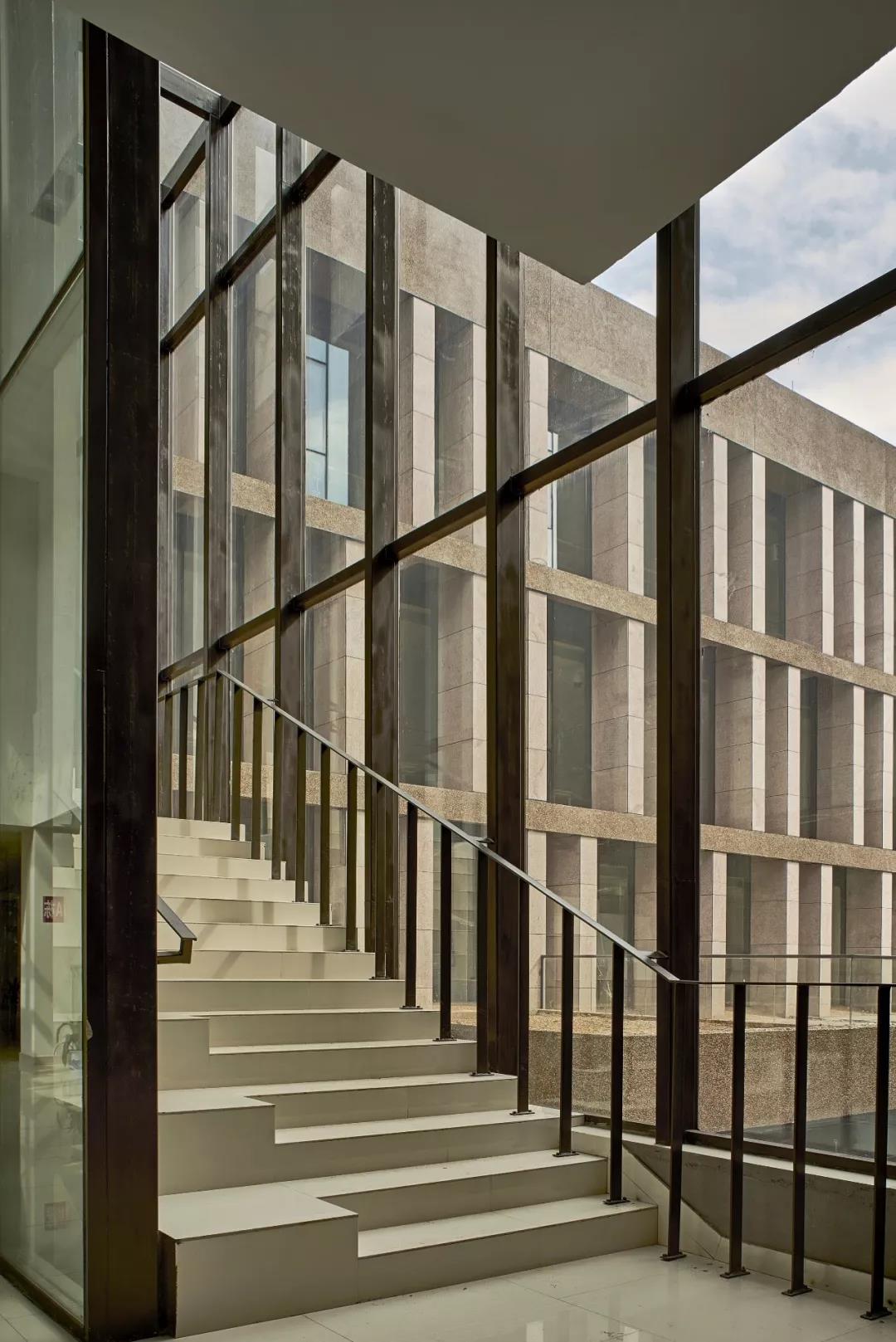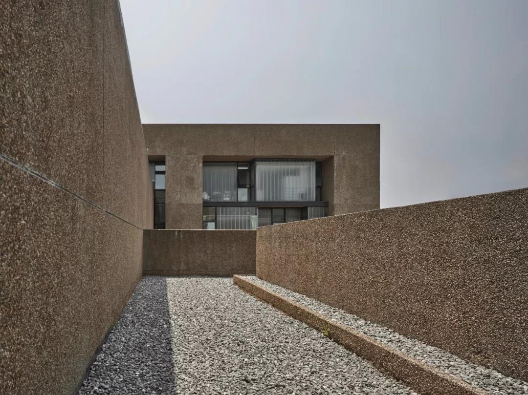 墻面采用水刷石材料有著歷史文化傳承的考量——老校區充滿著使用這種材料的新舊建筑,但更多的是對石子自身特有屬性對塑造氛圍所起作用的認識。上墻的天然卵石子是從湘江中淘出,并經過人力的多次篩選而來的。如果仔細辨識,可以發現每顆石子形狀各有不同,顏色在同一色系下也千差萬別,石子之間甚至可以看到嵌入的貝殼、生物殘骸和沙礫等雜質。這無數差異化的微表情在光線的沐浴下顯現成一種濃烈的暖調,強化了建筑的棱角和體塊,彌散在校園的場所中,人們都被籠罩其中,還原了契里柯的畫意。
