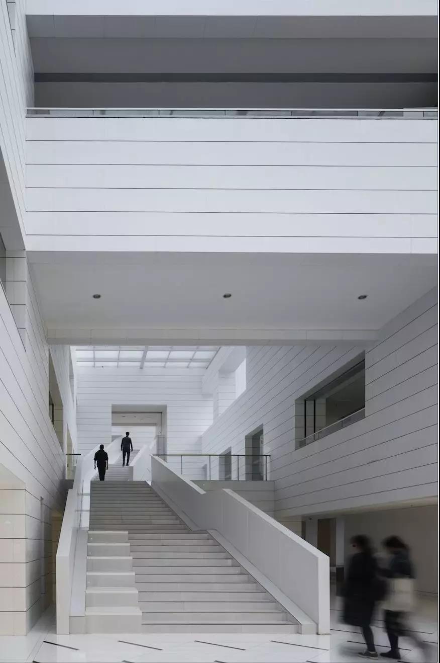 設計在樓與樓之間重構了契里柯繪畫里深景******的街景,找尋中間“空”的況味,通過簡單的排列邏輯進行組合,產生深邃的、具有某種歷史場景感的東西。其中最典型的是理工樓群的設計,A 樓與B 樓(物理與微電子科學學院樓)面面相對的部分都采用了單元體交錯并置的方式,仿佛端坐在兩側的石像彼此之間的緘默對望,中間夾著一條綿長甬道,指向著這條軸線的遠端的收口——C 樓(數學學院樓)端部如同彎曲手臂一樣的奇怪懸挑。