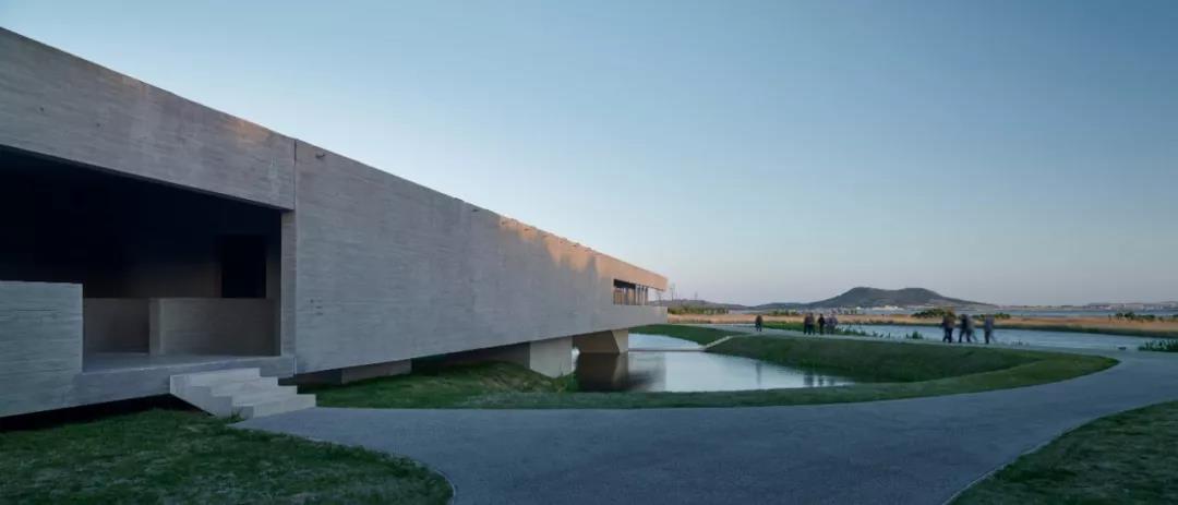 建筑選址于濕地東北角,此處背靠一片茂盛的黑松林,面朝整個濕地景觀。建筑在場地中的形象可以被理解為一座“橋”和一座“塔”:水平向的景觀廊長71米,如同濕地上的一道長橋,架空漂浮在柔軟的土壤和水流上,最大化地保持了自然地形的延續性,又如一把從濕地伸入水面的標尺,通過自身的水平性提示下方地形的變化;豎直的瞭望塔高15.6米,如同水邊的燈塔,為游客觀景提供了一處可以俯瞰濕地、遠眺馬山的高點視野。一橫一豎兩個體量,在空間的三個維度上與場地緊密地聯系起來。