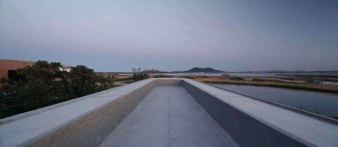 在建筑伸向水面的一端,“橋”與水面的接觸點化為一部從水面探入建筑的直跑樓梯,游人可在此從咖啡廳標高下行至一處漂浮于湖面的平臺。平臺與水同高,它與向水面挑出的建筑體量共同創造出一種于水平方向延展的壓迫感,建筑作為場地標尺的意義因此得以彰顯。