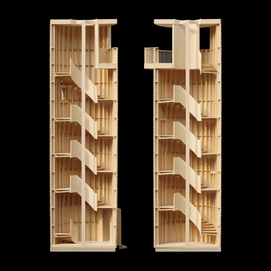 木塔內部的主要光源來自屋頂中心的天光,因此建筑空間整體呈現出從低到高逐漸由暗變亮的狀態。進入塔內后,空間起初較為幽暗,游覽者可沿木質樓梯盤旋而上,途中會經過幾個小窗洞,透過窗洞可隱約窺探到一幅幅片段化的“框景”。隨著高度的上升,室內逐漸變亮,直至到達旋轉樓梯盡頭的塔頂瞭望平臺后,視線才終于打開,由此可俯瞰到整個天鵝湖的濕地景色。