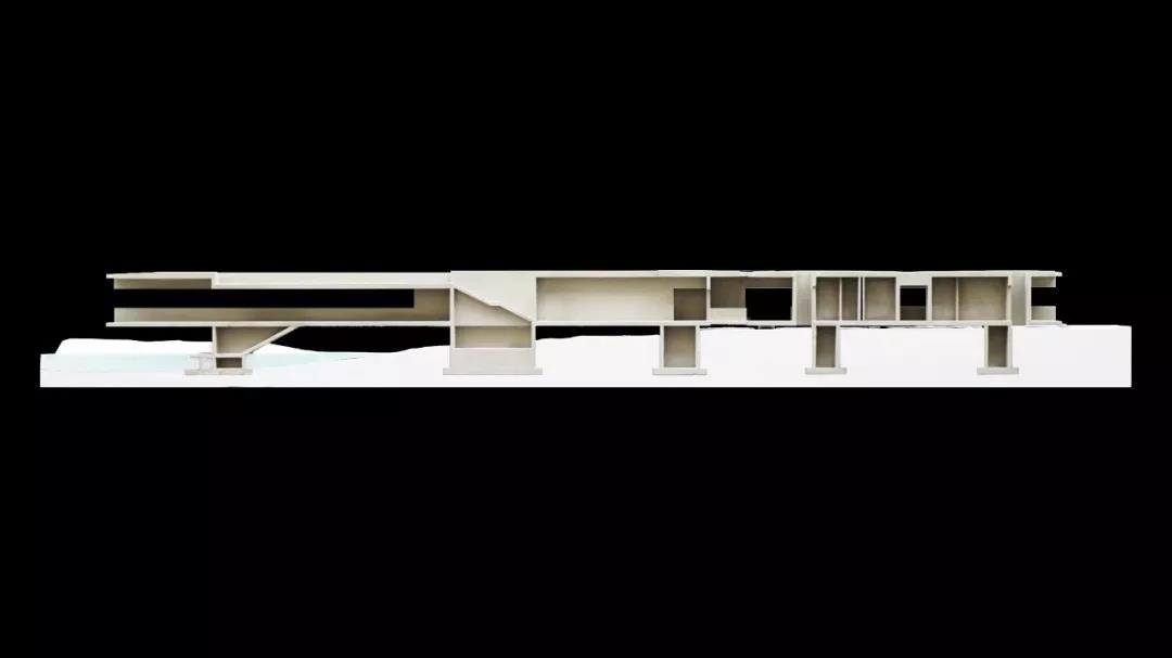 為了實現橋式的大跨度結構,建筑采用全現澆木模混凝土這一種結構即建筑的建構方式,在兩塊水平樓板中布置了若干起結構作用的現澆墻體,在增強結構整體性的同時分隔出不同性格的建筑空間。