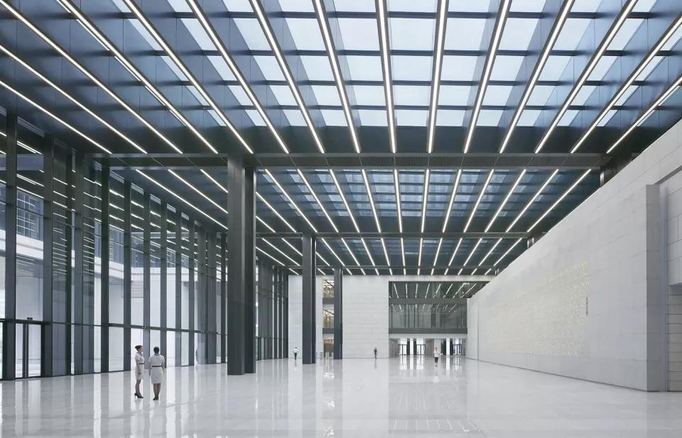 建筑群由一個堅實的基座、通透的連接部分和一座仿佛懸浮其上的體塊組成。淺色橫向花崗巖立柱刻畫了建筑立面的整體形象,形成了建筑群造型語言的主題,因其具有一定的進深還起到了為室內空間遮陽的作用。煤黑色豎向框架與淺色花崗巖產生對比,幕墻框架內還集成安裝了遮陽窗簾,構成了一個散熱建筑外表皮。建筑室內空間的設計也選擇了相似的材料元素,園區、單體建筑不同功能區域均保持了一致的設計風格。