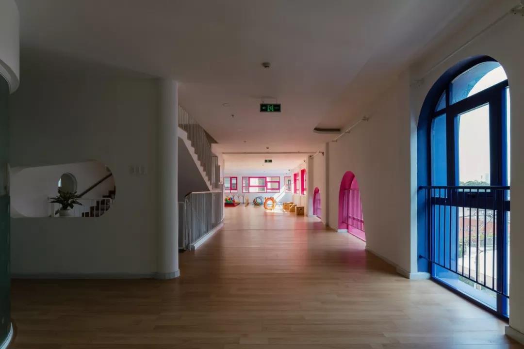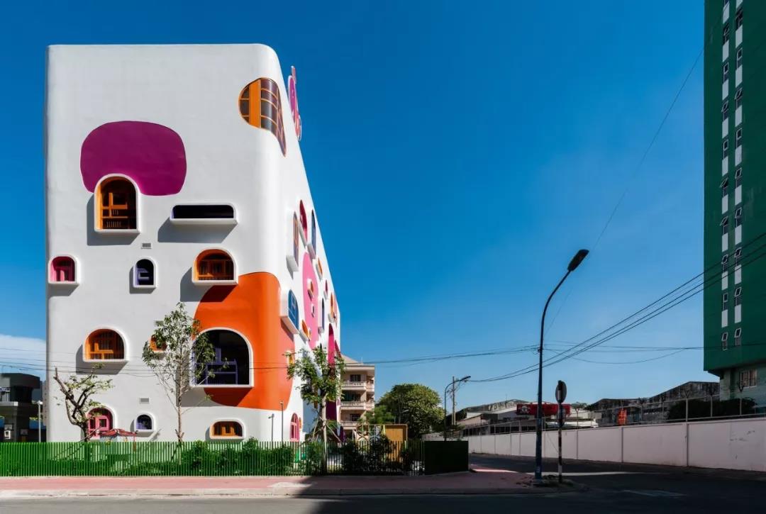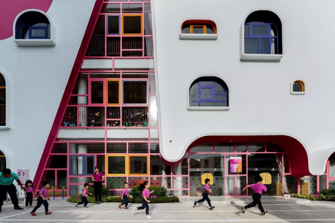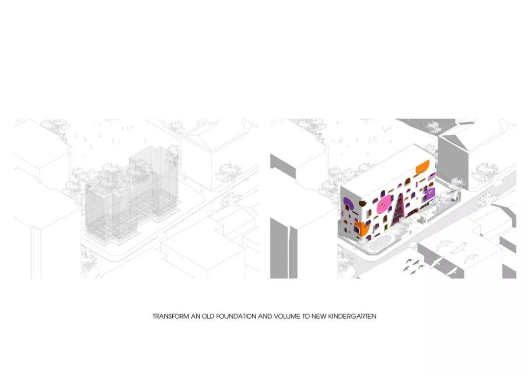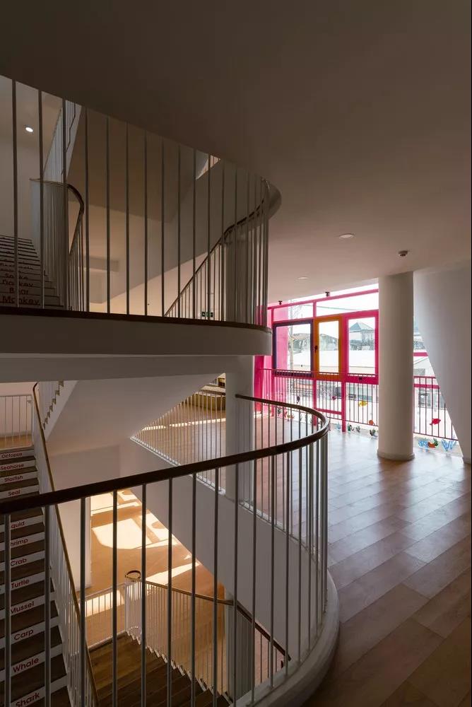 該建筑共有5層樓,下面3層用作教室和室內游樂場。上面2層用于組織活動,員工培訓和學校管理部門。作為孩子們的“游戲”之家,該幼兒園建筑通過簡單的造型與高寬窗戶之間構成一定的比例關系,有趣地表現出了它的特征。