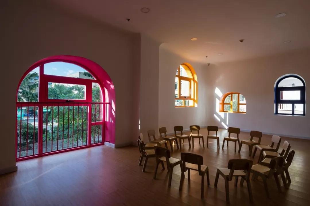光線透過這些窗戶可以沿著彩色的窗臺流動,就像染色的色彩流淌在室內空間里,吟唱出一種迷人而又童話般的氛圍。