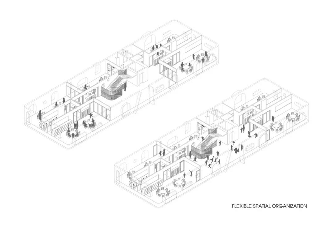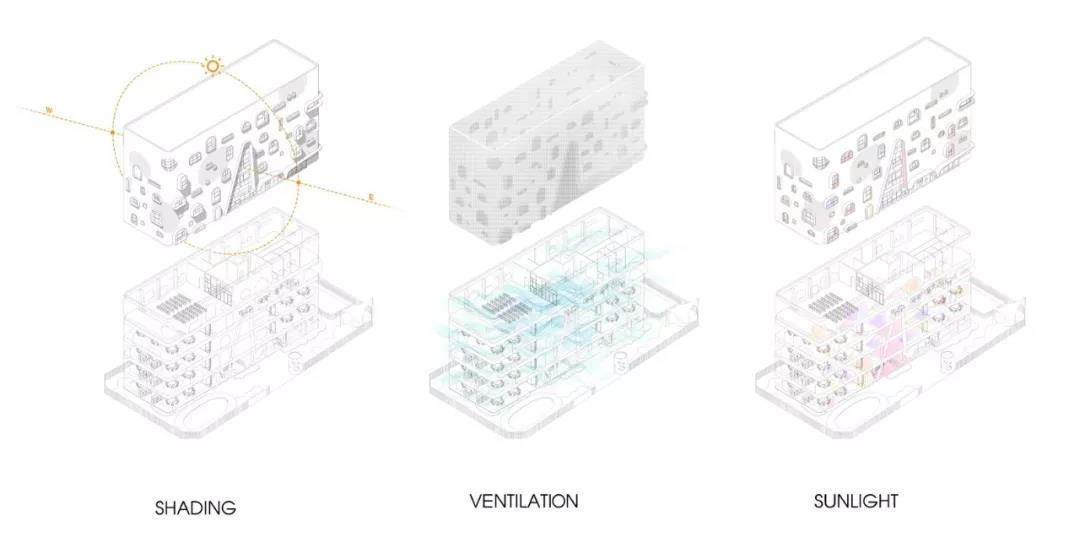窗口布置似乎是隨機的,但它還是通過系統地計算確保了每間教室在使用時獲得足夠的自然光和通風。加長的窗臺也有助于防止陽光照進室內空間。
