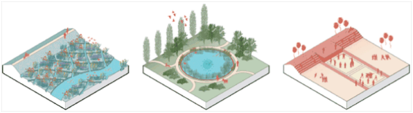 這些區(qū)域通過(guò)種植和開(kāi)展適應(yīng)氣候變化的活動(dòng),創(chuàng)造多種景觀(guān)環(huán)境,包括生態(tài)濕地、爛漫花田、可食農(nóng)業(yè)園、開(kāi)闊草原、森林秘境等。以及利用河流廊道內(nèi)可泛洪的活動(dòng)空間,設(shè)計(jì)探險(xiǎn)樂(lè)園、運(yùn)動(dòng)場(chǎng)、單車(chē)道、人行步道、古道單車(chē)、滑板空間等活動(dòng)場(chǎng)所來(lái)激活河流前灘。