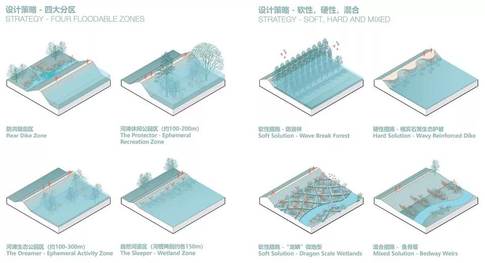 方案提出三個(gè)策略作為設(shè)計(jì)概念框架的回應(yīng):“水岸重生”作為對(duì)氣候變化造成的雨洪問(wèn)題的響應(yīng),“激活生態(tài)”用于支持場(chǎng)地的排洪系統(tǒng)、雨水管理以及促進(jìn)生物多樣性的提高,“彰顯人文”則用于反應(yīng)西安豐富的歷史傳統(tǒng)與文化背景。