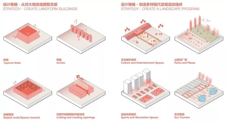 基于對(duì)西安傳統(tǒng)建筑語(yǔ)言的理解,雕塑或夯實(shí)景觀(guān)形成建筑的實(shí)踐或語(yǔ)言是顯而易見(jiàn)的,方案利用泥土的移動(dòng)作為堆砌地形及塑造建筑的主要因素來(lái)反應(yīng)當(dāng)?shù)亟ㄖL(fēng)格的傳承與發(fā)揚(yáng)。同時(shí),方案提出的三個(gè)策略為場(chǎng)地12個(gè)主要地區(qū)的串聯(lián)建立了設(shè)計(jì)語(yǔ)言,包括陜商故里、水晶明池、龍鱗濕地、藝術(shù)博物館、農(nóng)業(yè)旅游等。