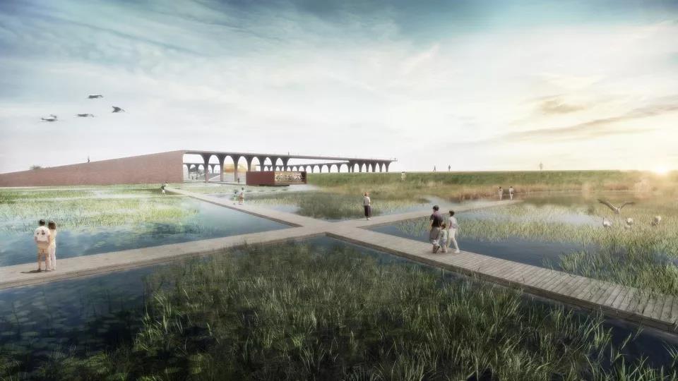 在這里,拱廊區(qū)域不但呈現(xiàn)了絕佳的河岸觀(guān)光視野,提供了海綿城市生態(tài)基礎(chǔ)設(shè)施,也開(kāi)辟了一個(gè)大型封閉式文化廣場(chǎng)作為活動(dòng)慶典舉辦的場(chǎng)所。這種現(xiàn)代拱頂磚砌美學(xué)工程在一系列高聳的生態(tài)瞭望臺(tái)和橋梁之間得以延續(xù),對(duì)重要的景觀(guān)空間與聯(lián)系做出回應(yīng)。
