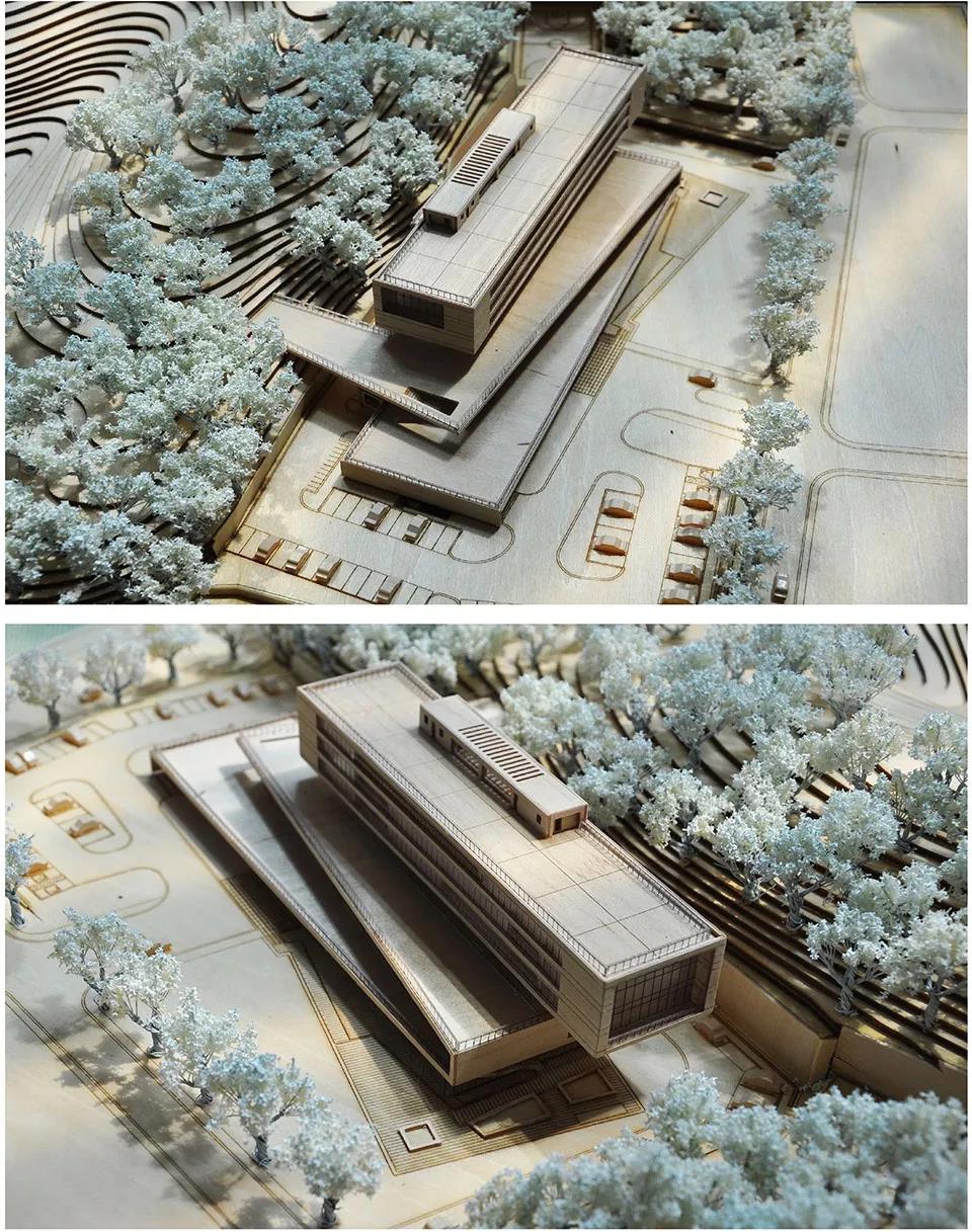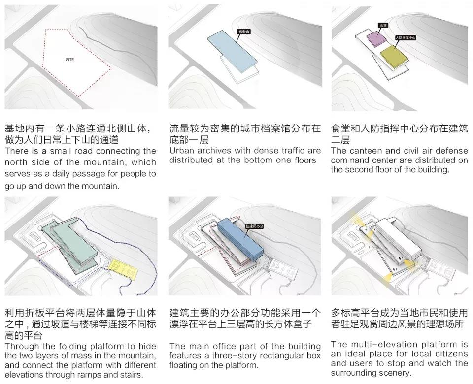 設計首先將人流密集的城市檔案館置于底層與半地下室;再將食堂置于二層靠近西側道路處,將人防指揮中心布置在二層靠近山谷腹地處,利用折板將下兩層體量隱于山體之中;最后,將住建局辦公置于折板之上,通過懸挑等手法使建筑有一種于山體之上的視覺效果,最大程度的利用景觀資源。建筑主要的辦公部分功能采用一個漂浮在折板平臺上三層高的長方體盒子,純粹而簡潔的形體順應南側折板平臺走勢,并與北側山體等高線平行布置;同時,盒子在東側懸挑于三層以外約12米,使盒子與下部折板平臺形成了在錯動中取得平衡的一種形體組合。