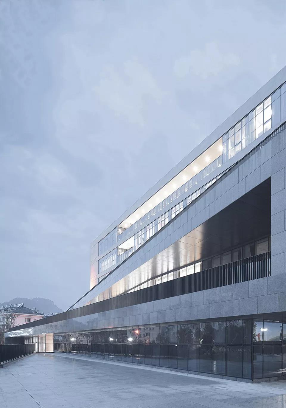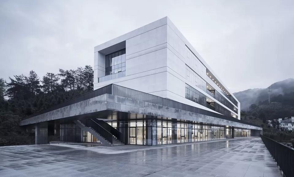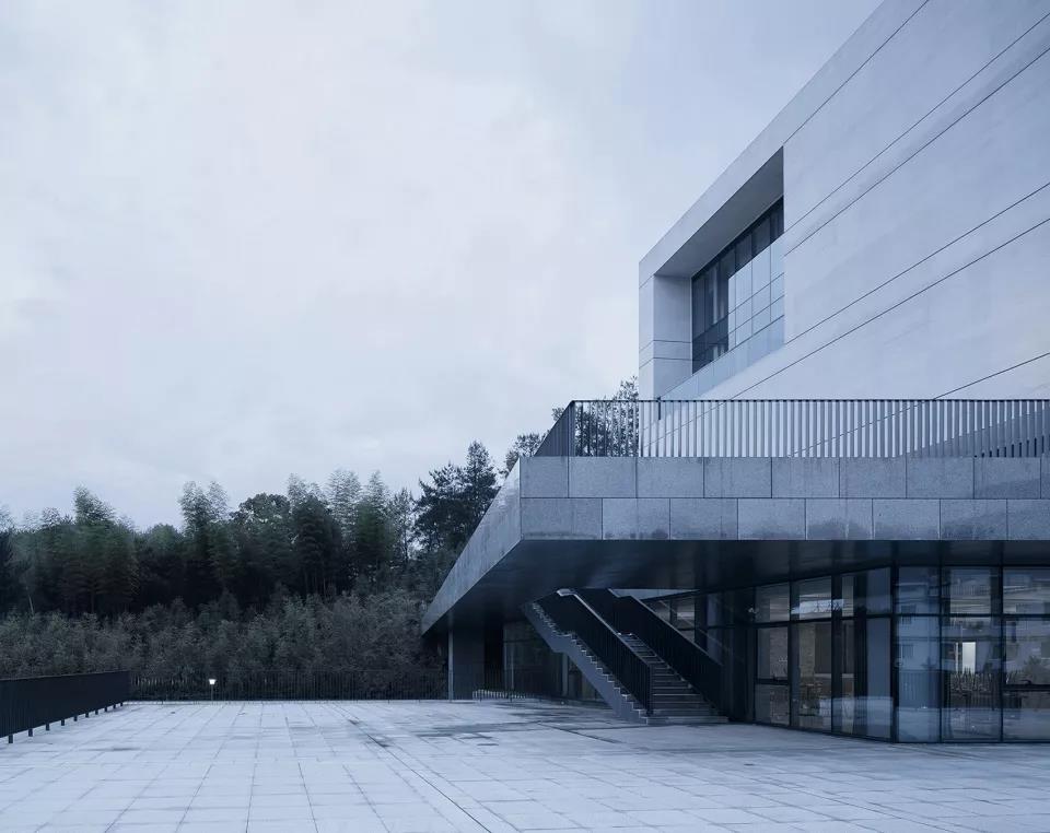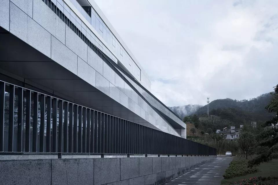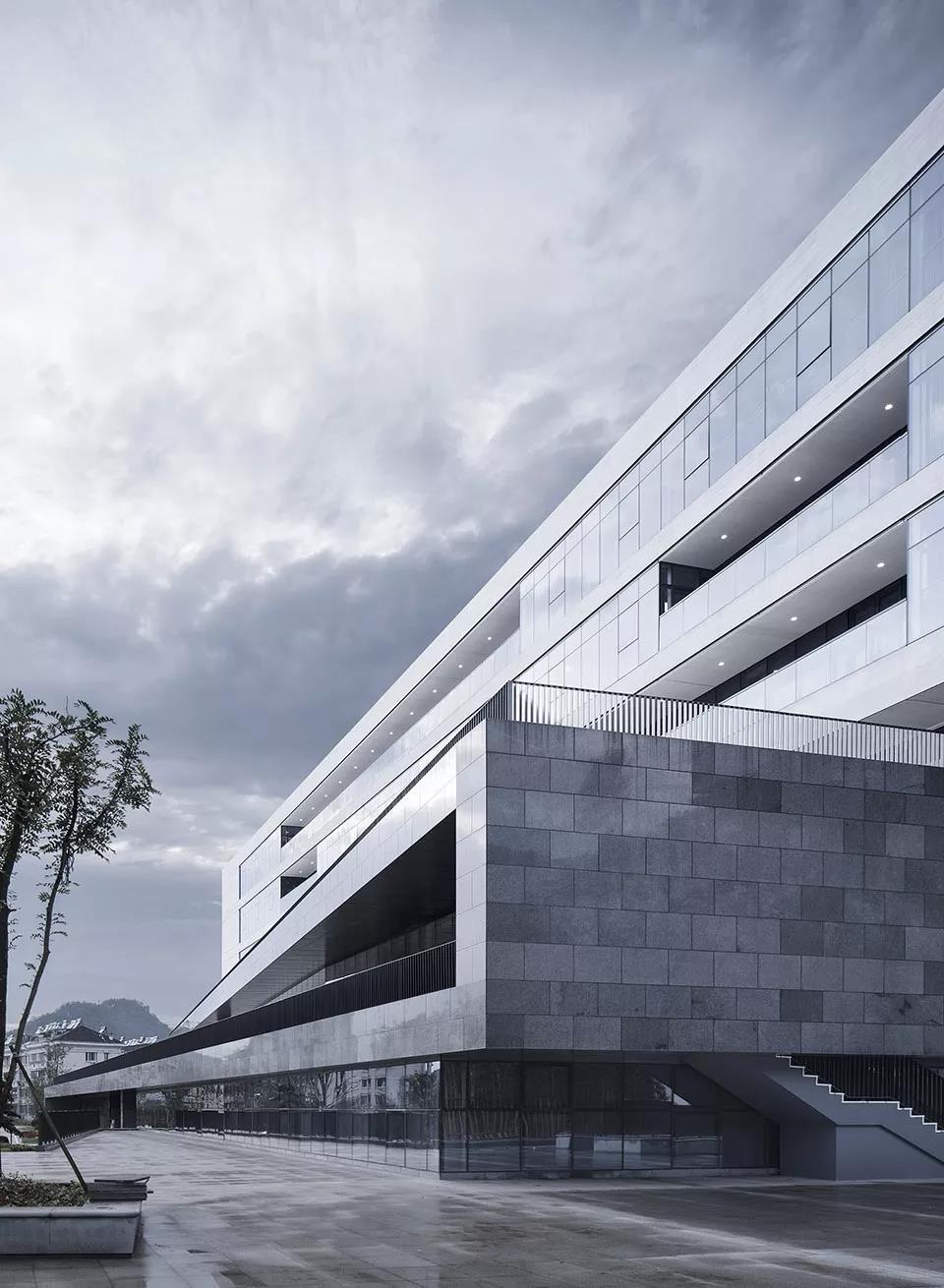 建筑采用黑白灰色系以體現開化山水城市及中國山水畫卷中的具有人文意境的建筑色調,待山中云霧繚繞時,建筑的基座消隱在山中,上部灰白色的盒子猶如漂浮在山中,同時站在不同的平臺上觀遠處山景和江景,形成了一幅建筑與周邊山體和天空融為一體的感覺。