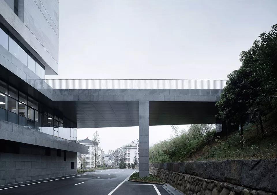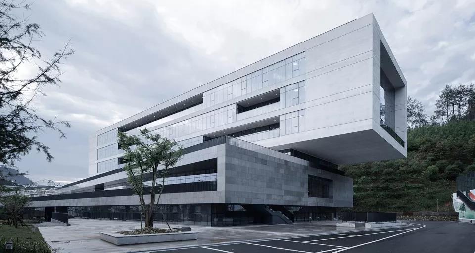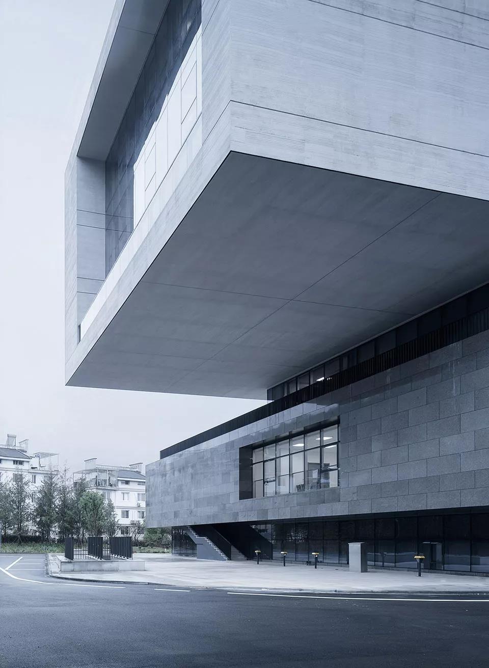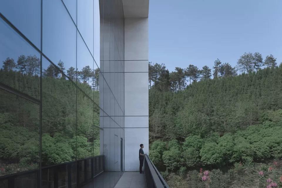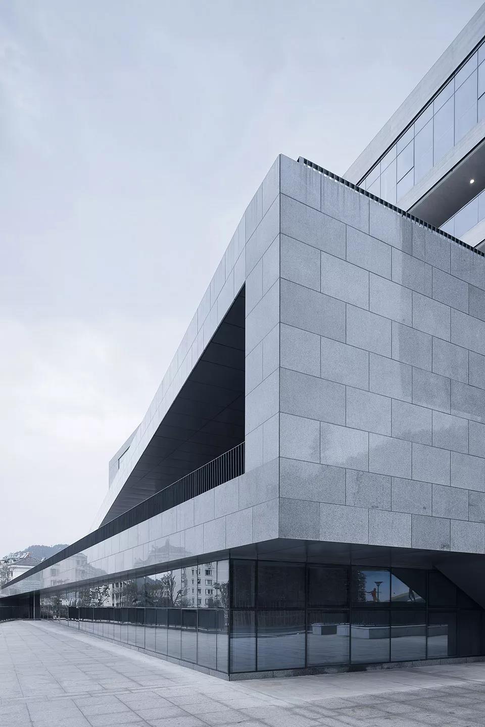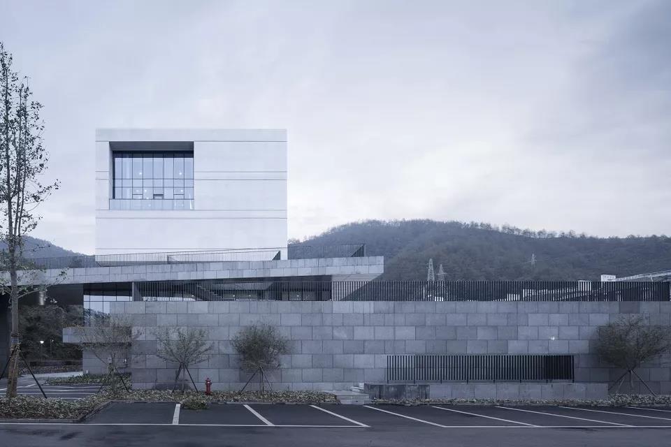建筑采用黑白灰色系以體現開化山水城市及中國山水畫卷中的具有人文意境的建筑色調,待山中云霧繚繞時,建筑的基座消隱在山中,上部灰白色的盒子猶如漂浮在山中,同時站在不同的平臺上觀遠處山景和江景,形成了一幅建筑與周邊山體和天空融為一體的感覺。