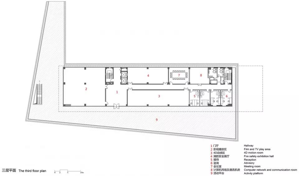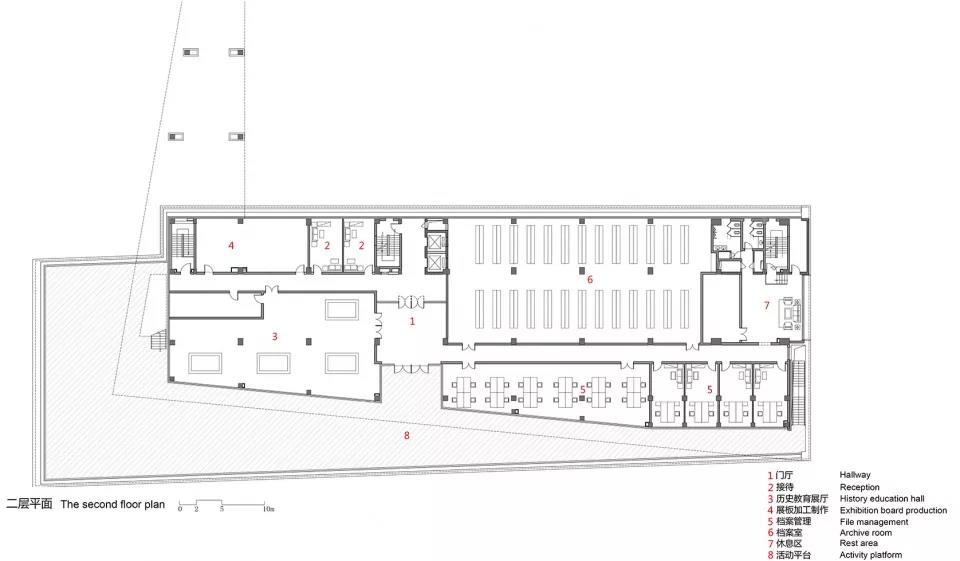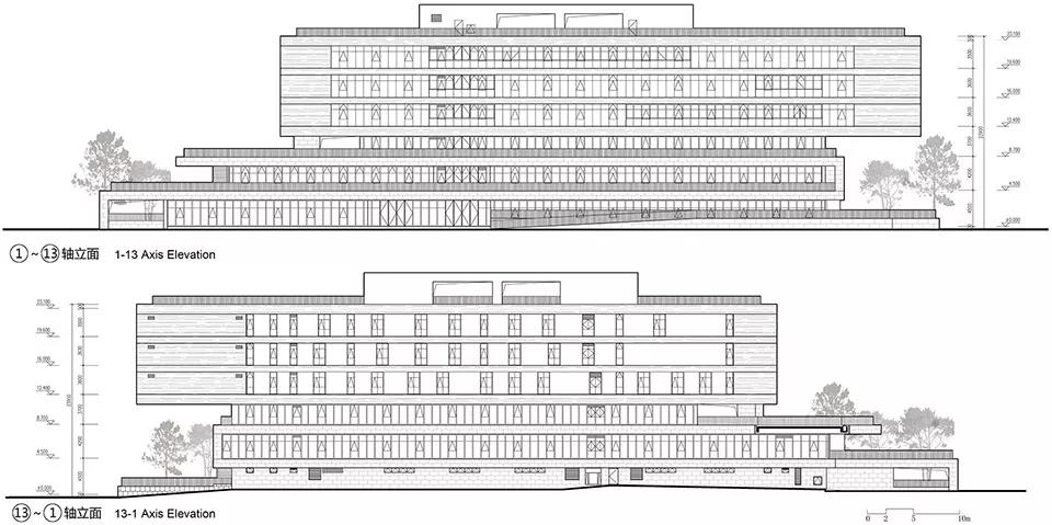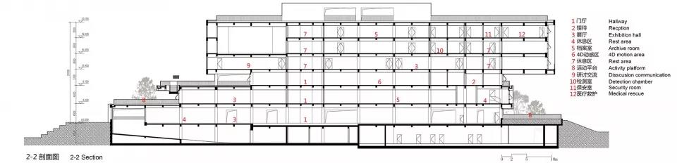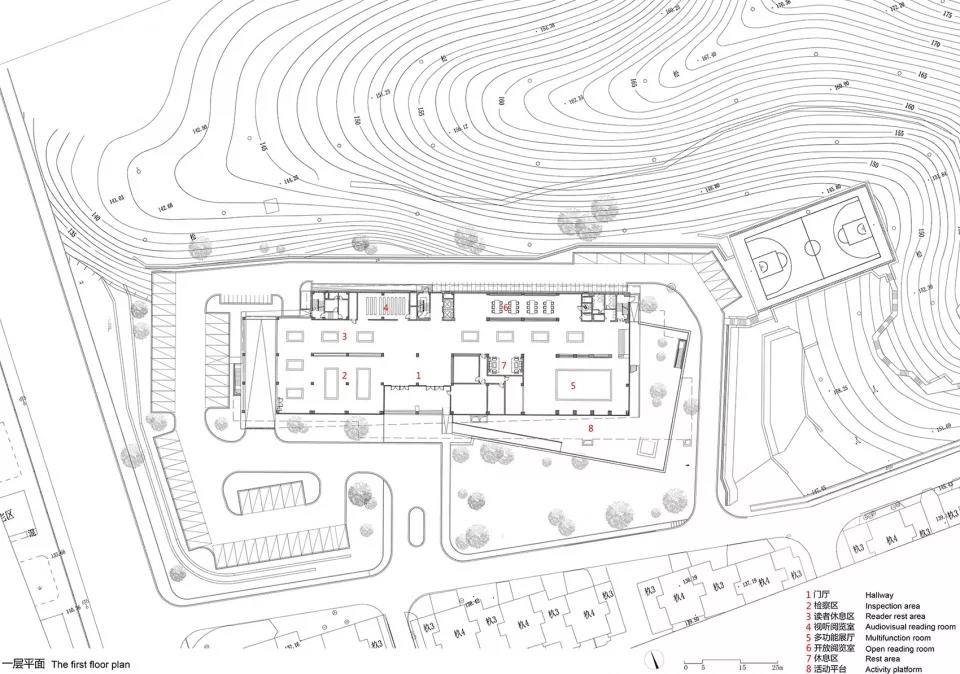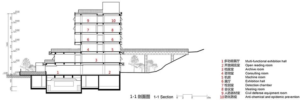 基地內有一條小路連通北側山體做為人們日常上下山的通道,設計為了充分尊重現狀場地和諸多外圍的景觀資源,提出了不同標高平臺的解決方案。即將人流量較為密集的城市檔案館分布在底部一層,通過坡道與樓梯等連接不同標高的平臺,猶如北側山體等高線的延續,使下部建筑與山體自然融為一體。這不僅恢復了原有上下山通道,同時多標高平臺又成為當地市民和使用者駐足觀賞周邊風景的理想場所。