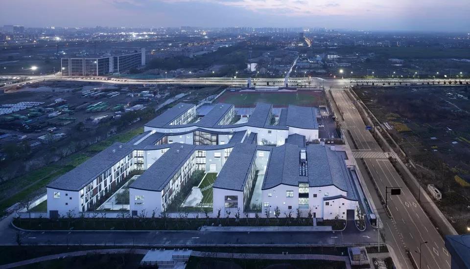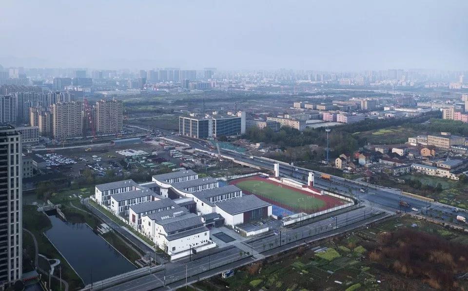 杭州杭行路小學,位于杭州西北部良渚組團,毗鄰環境優美的京杭大運河沿河景觀帶,現狀用地東面為運河支流沿河景觀帶,其余多為農田、空置場地及少量農居點,周邊呈現出自然生態的景觀空間。