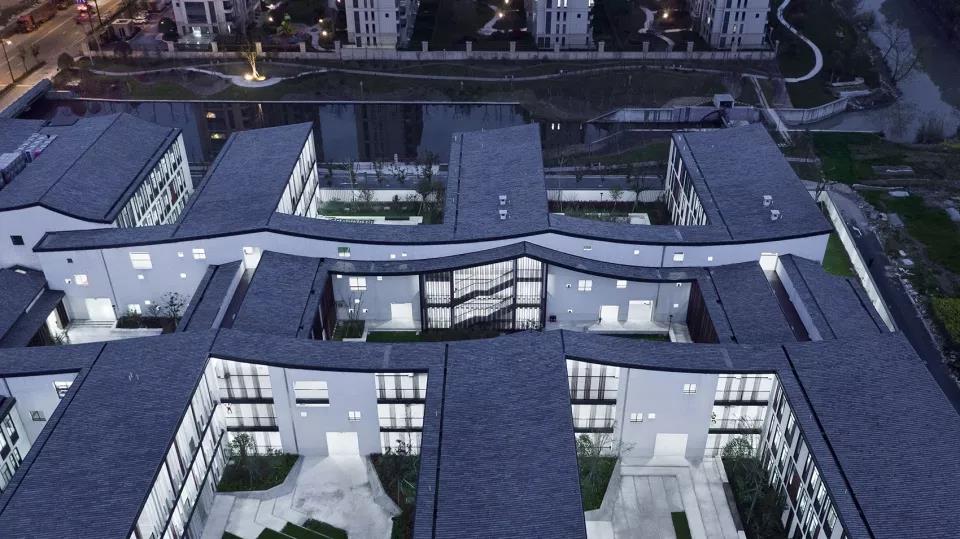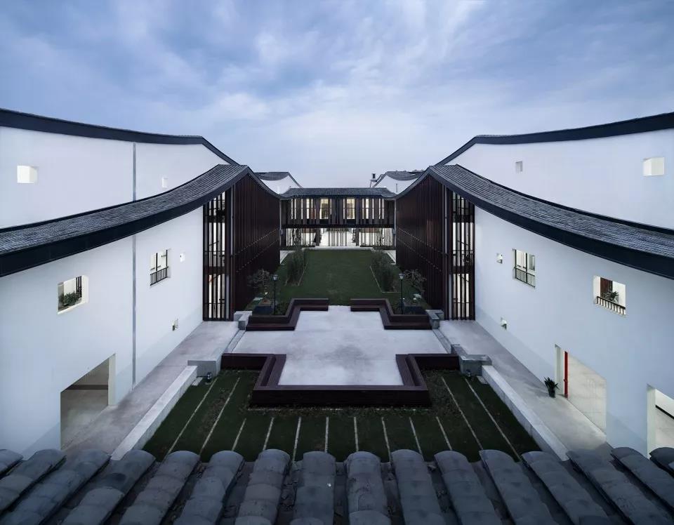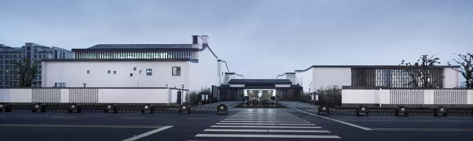 建筑形式采用傳統中式建筑意向,結合現代的處理手法,與杭州整體的運河景觀相融合。屋面形式呼應傳統山水,采用概括提煉手法,用曲折的屋面模擬連綿起伏的自然山脈,力求體現自然山巒的形態和神韻;白色涂料墻面與灰色瓦屋面,回應了傳統建筑的粉墻黛瓦,搭配局部的仿木材質與竹子等裝飾構建,回應傳統建筑中的木構特征。整座建筑從空間到形式,既蘊含了傳統建筑的神韻,又兼備了現代建筑的精神。