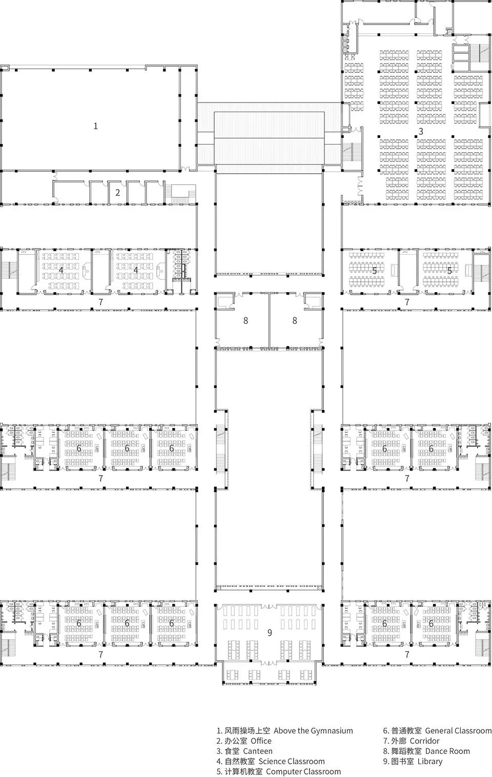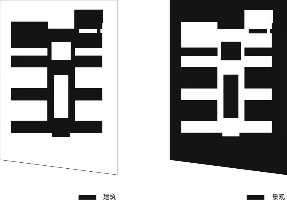 各個組團院落在空間上被連廊這一灰空間分割,但視域的滲透和氣流的流動卻沒有被阻斷,使得院落的空間層次感加深。各功能單元在一層圍而不合的空間結構,提供了院落間路徑和視線滲透的可能,使行人獲得步移景移的使用體驗,同時增加了學生活動更加豐富而多樣化的可能性。