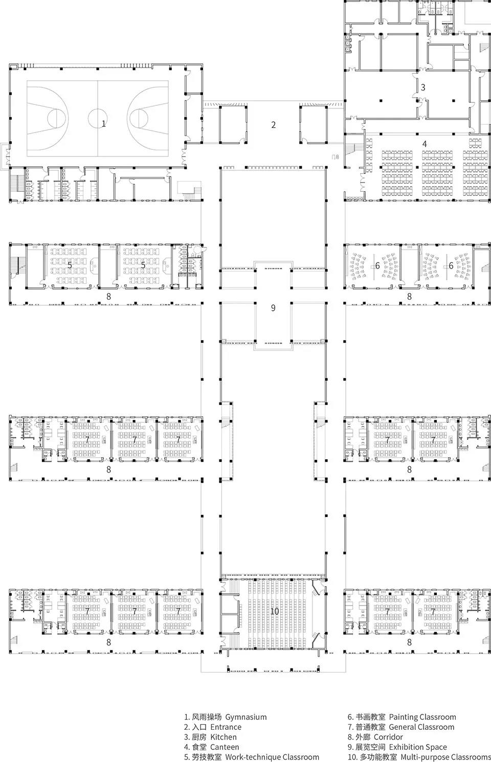學校主體建筑群主要由教學區、體藝辦公區和后勤區組成,環形風雨連廊連接各個功能區,使得建筑成為一個有機的整體。學校以“園”為基本構成單元組織校園空間:教學綜合區以一條南北向中軸串聯整個區域,回型風雨廊將各個院子串聯成為一個整體;對中國傳統建筑園林空間中“半房半院”的組織手法加以傳承和演繹,在場地正交網格體系中選取U型建筑體量作為基本的模塊單元,加以重復、組合滿足多重功能需求,U型建筑單體圍合成多個院落空間,并相互滲透、疊院成園,營造出園院相嵌、圍而不隔的園林化校園環境。