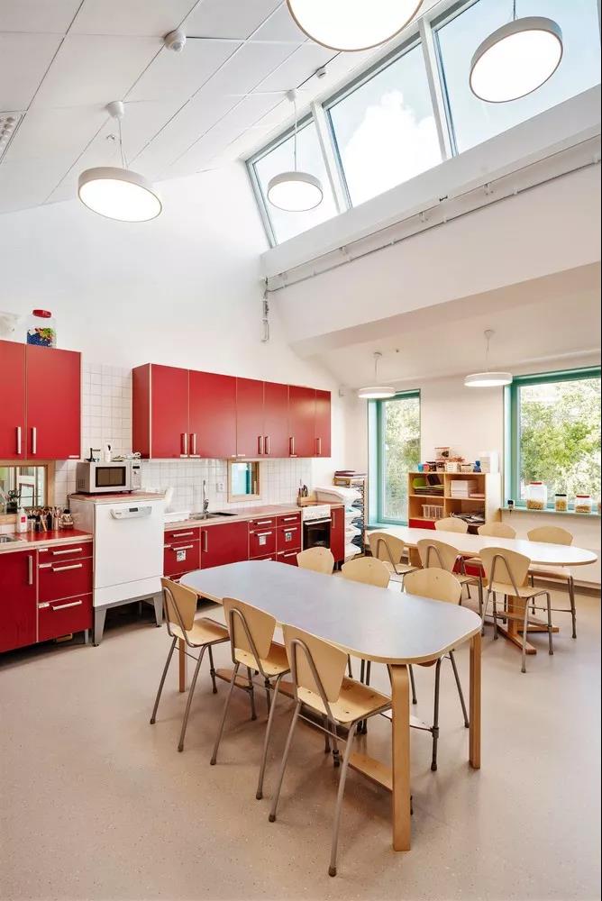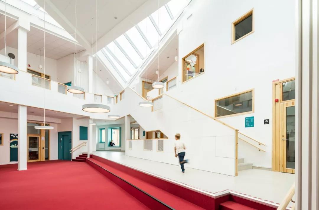 在室內(nèi),學(xué)習(xí)環(huán)境聚集在共享“中心”周圍,達(dá)到雙層高度。大的矩形天窗在白天給空間帶來(lái)充足自然光。功能***和節(jié)省空間的布局取消了走廊,因此創(chuàng)造了安全和適合密集人口的空間。