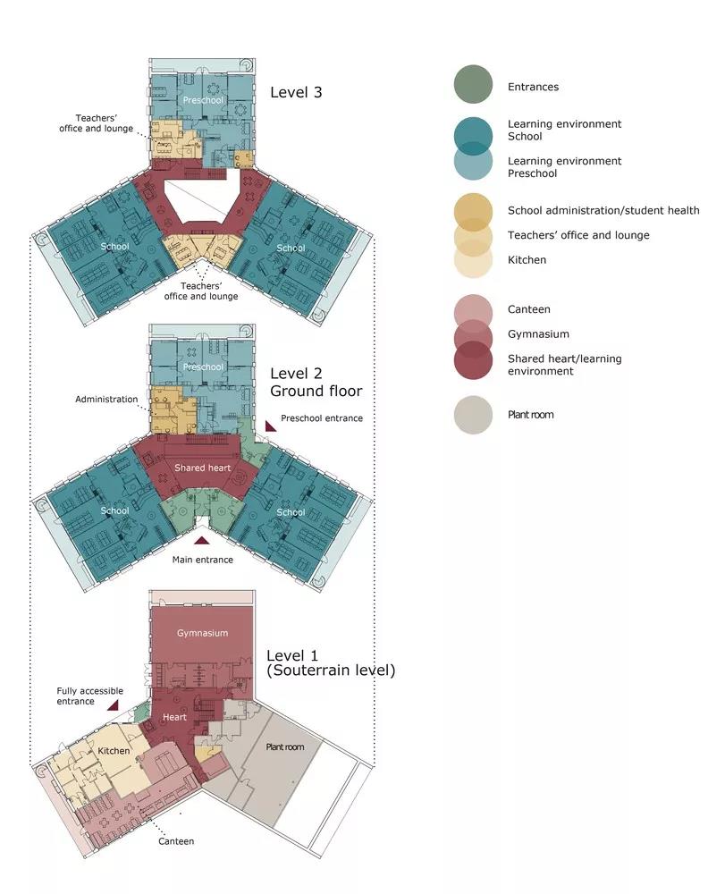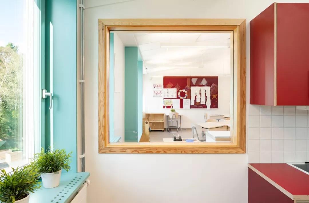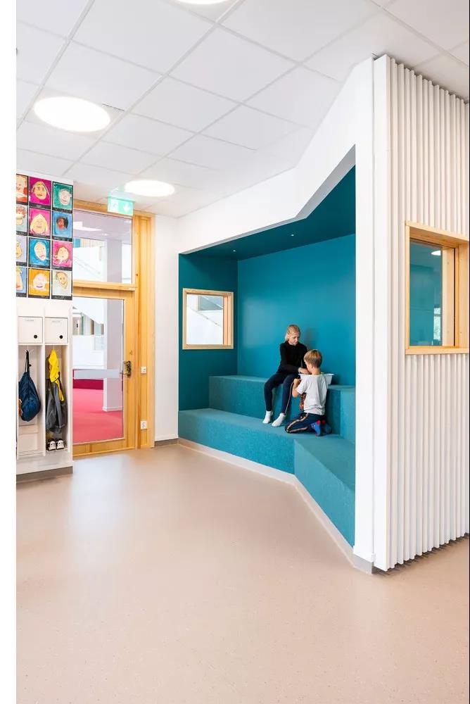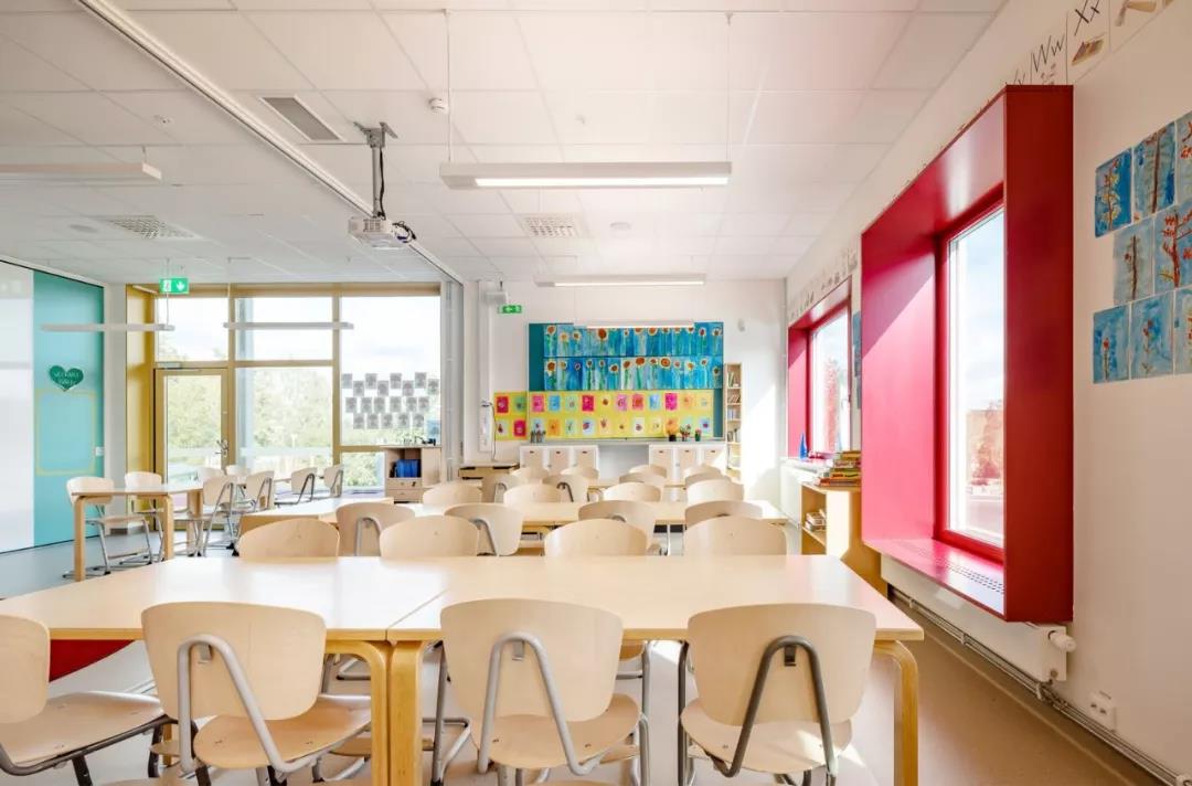 學(xué)校的學(xué)習(xí)環(huán)境被分成針對(duì)60個(gè)學(xué)生的不同部分,包括大小不同的學(xué)習(xí)空間、階梯、衣帽間和衛(wèi)生間。通過(guò)學(xué)習(xí)環(huán)境內(nèi)不同的空間,每個(gè)學(xué)生有機(jī)會(huì)找到他們最喜歡的地方,教育者也有機(jī)會(huì)在每個(gè)特定的情況下改變和適應(yīng)他們的教學(xué)。