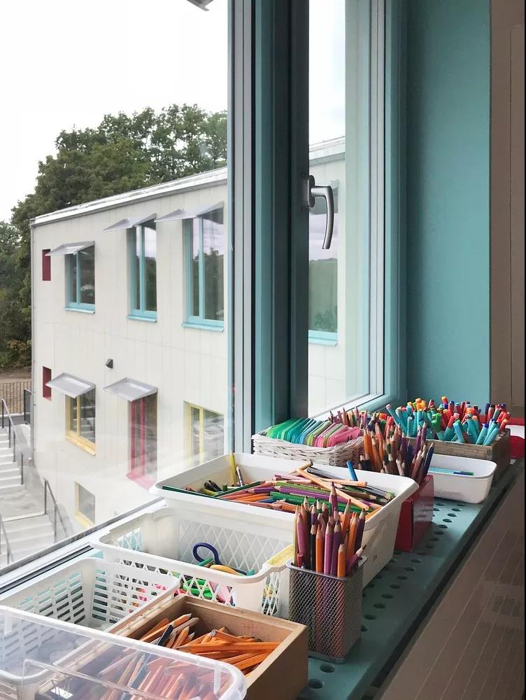 學(xué)校室內(nèi)外都使用了暖色和鼓舞人心的色彩方案,這也成為了它的特點(diǎn),建筑山墻和窗戶的顏色也被用于室內(nèi)。學(xué)習(xí)環(huán)境被設(shè)計(jì)成充滿活力和自由的,通過(guò)對(duì)空間的組織和細(xì)節(jié)的關(guān)注促進(jìn)合作。