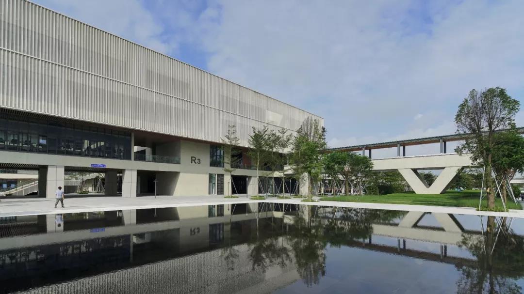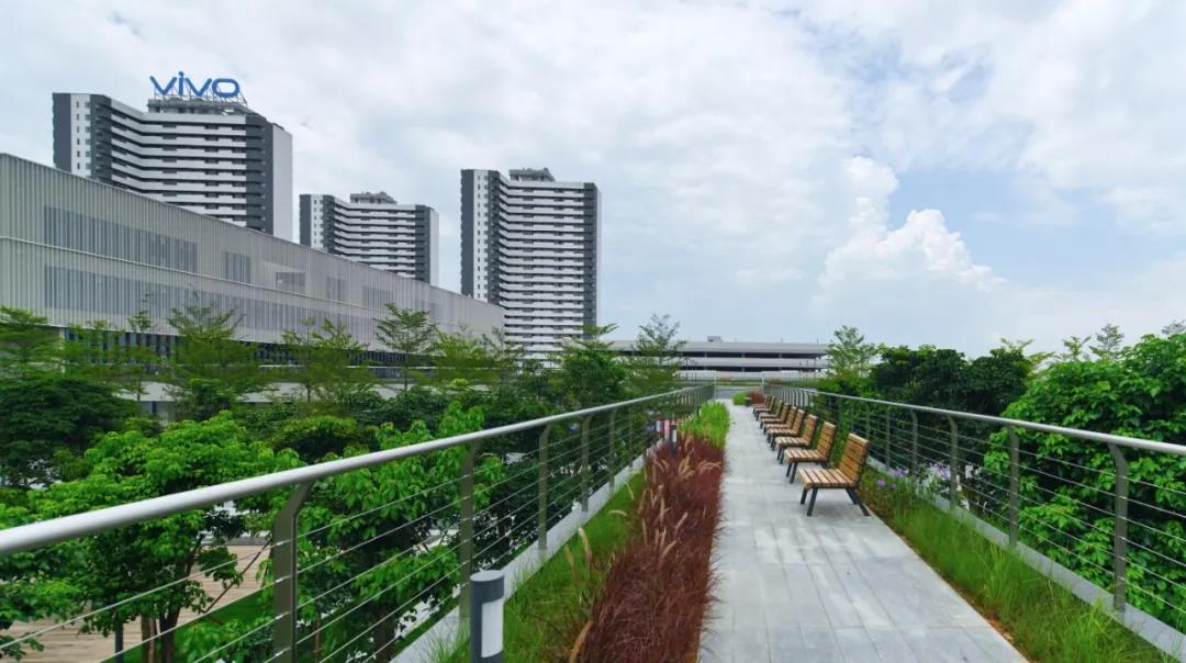 在園區的中軸線上,是一系列豐富有趣的景觀廣場和連廊,直至盡端的vivo park,多彩的植被,和緩的流水,構成了優美的園區環境。