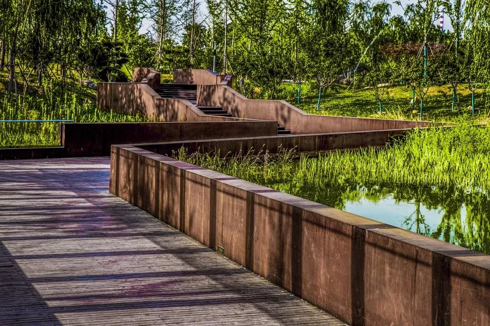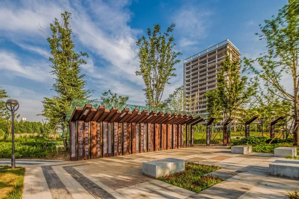 考慮到現代設計語境下的古典底蘊與文化重生,我們引用了經開區代表工業特色的耐候鋼板為素材,進行打孔、拉絲等處理打造富有科技感的特色景墻,同時結合《論語》經典地刻及郗鑒生平簡介,層層打造郗鑒湖公園的文化滲透。