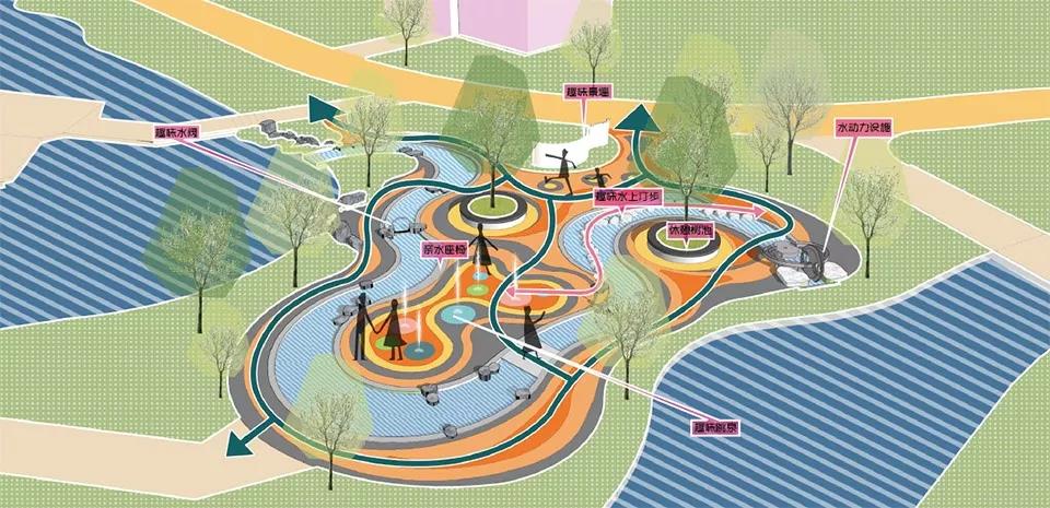 亮點策略:文化再生,將傳統文化當中的精髓,用現代手法進行提煉解構,重新演繹,通過多維度進行文化展示。生態可持續,利用海綿城市技術打造會呼吸的公園?;盍σ?,打造濱水活力空間,利用現代科技手段加強人與公園的互動,并為人的多樣化活動提供個性場地。