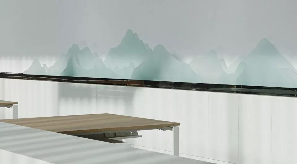 B2層發光的“玉山”是希望點一下項目所在的地名為玉山鎮這個題。一層餐廳局部半圍合空間是因為防排煙的變化后增加了一臺排煙風機,局部吊頂標高下調了1.2米的應變,形式是湖石的類似荷蘭風格派的幾何抽象表達。