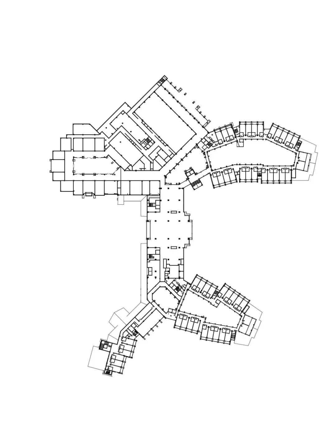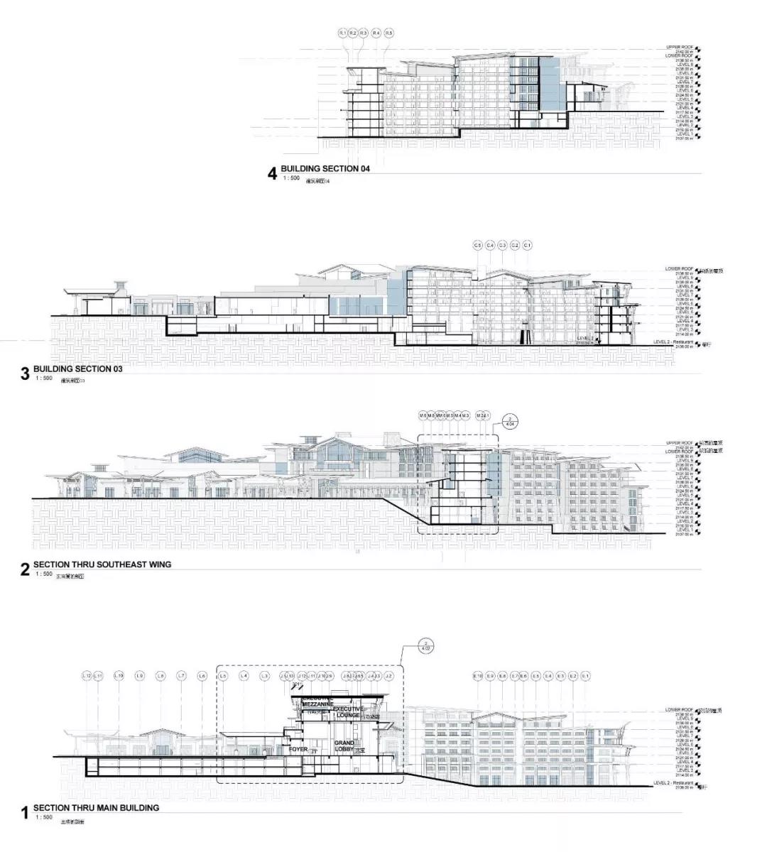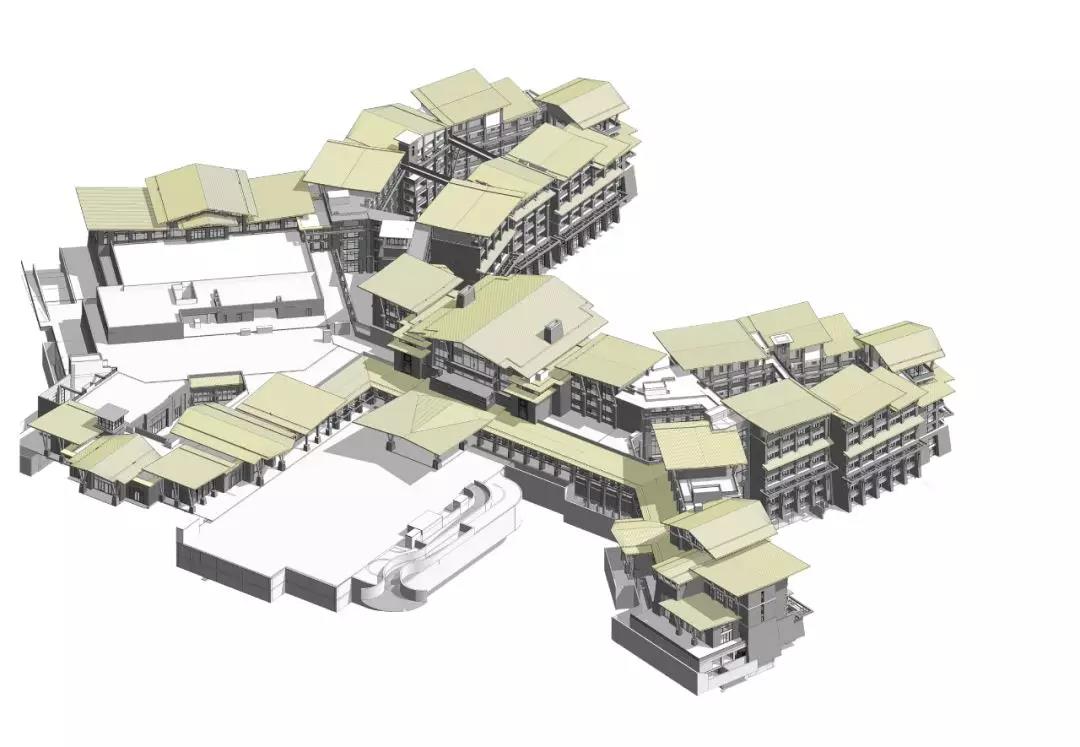 BIM全流程管理使設計師脫離傳統的繪圖方式,從而對概念的提取整合更具把控力。朝向洱海伸出的兩側為酒店的客房樓,中庭正靠蒼山的為酒店的功能區。設計師借鑒了白族民居“一正兩耳”、“兩房一耳”、“四合五天井”、“走馬轉角樓”等空間布局的形式。