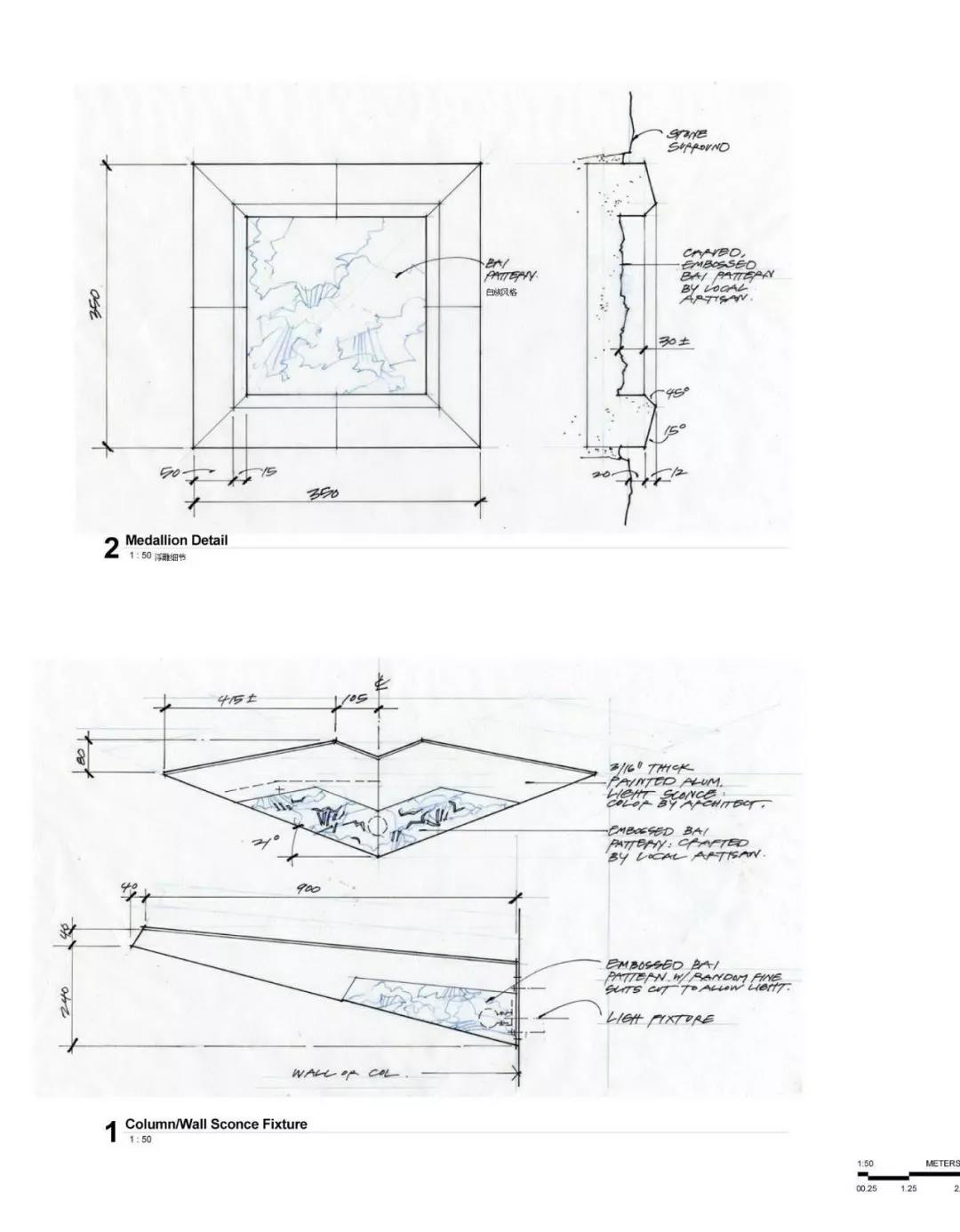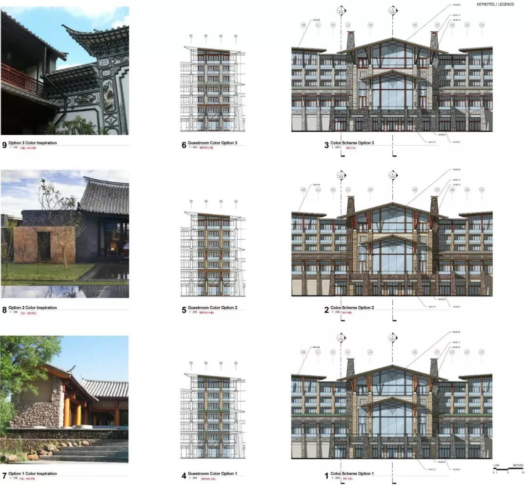 酒店立面選用大理盛產的石材,裝飾設計構思取材于白族傳統圖案。木質結構的屋頂結合金屬板,在保證功能的同時實現古樸親切的度假訴求。整體風格與自然風景協調一致,充滿詩意。 外墻面多為上白(石灰),下灰(細泥)粉刷,內墻面多用凸花青磚組合成豐富多彩的立體圖案,或鑲嵌自然山水圖案的大理石,表現出一種清新雅致的情趣。