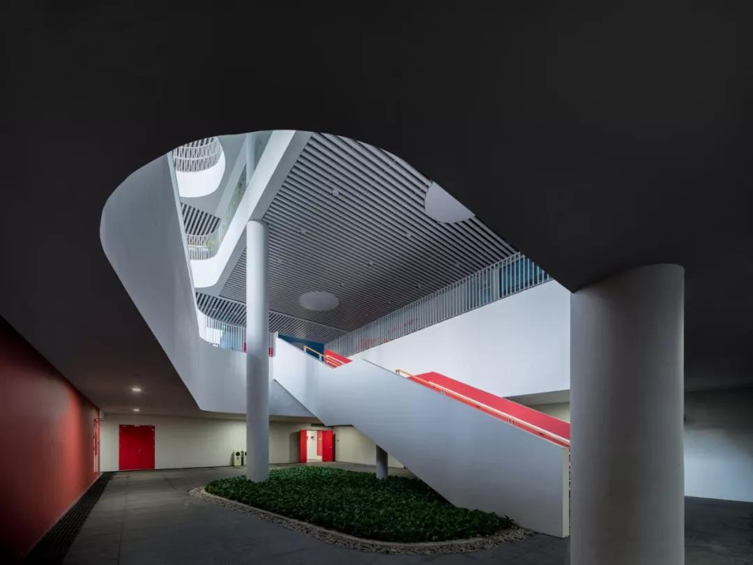 建筑營造出的空間,不止于合理性的滿足,同樣能傳達出正向的態(tài)度。當(dāng)下多元化的思想環(huán)境,學(xué)子不再拘于室內(nèi)苦讀,寬敞的連廊是所有人都能互相交流的場所;量體錯落下神秘的留白空間,是轉(zhuǎn)角偶遇新面孔的契機;明亮的大片白墻,從童心滿滿的彩色門窗開始示范,預(yù)想了未來涂鴉、展覽的場景,白墻雖不含感情,可也最包容。