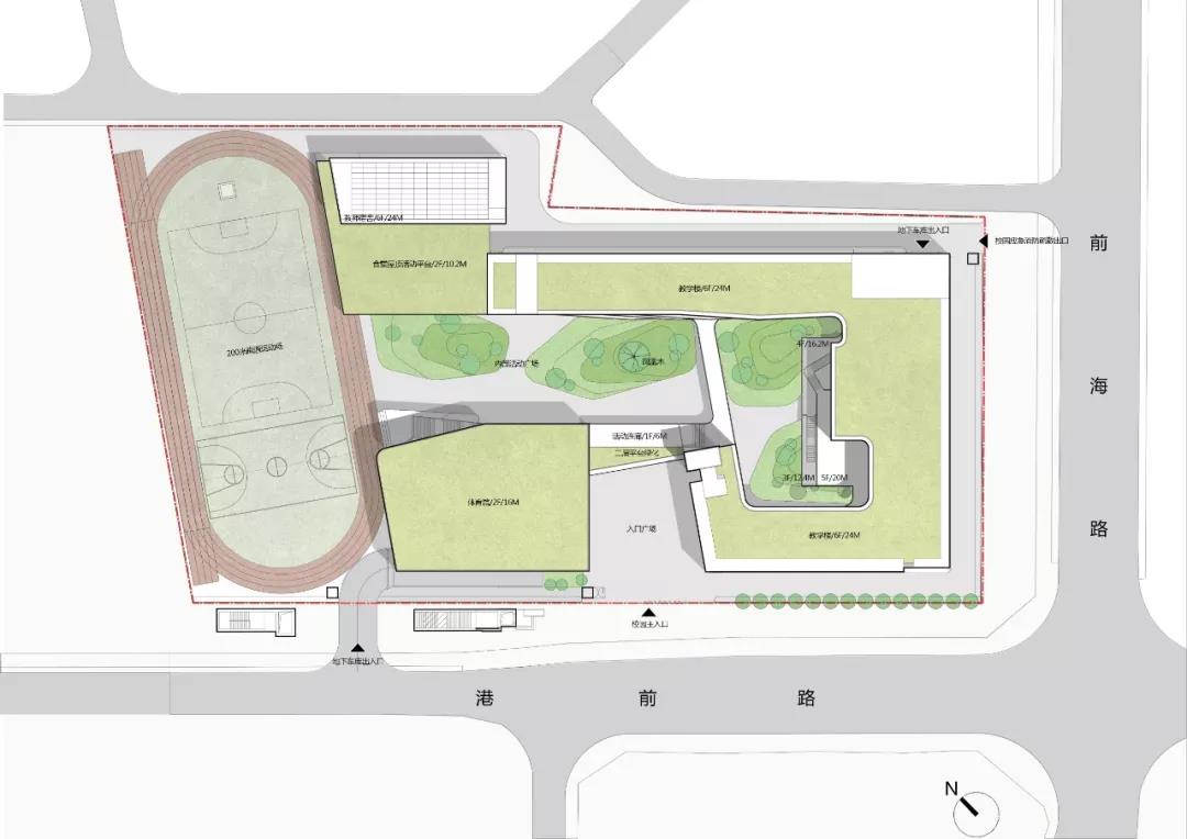 前海三小(現(xiàn)更名為深圳南山實驗教育集團荔灣小學(xué))坐落于深圳南山區(qū)大南山腳下,位于月亮灣大道以東,前海路以西,港前路以北,基地北側(cè)緊鄰居住小區(qū)。校園總用地面積13048平㎡,在起初的公開招投標(biāo)中,辦學(xué)規(guī)模要求是24班的小學(xué),由于周邊學(xué)位數(shù)量的嚴(yán)重緊缺,最后班級數(shù)量調(diào)整至不小于36個,因此最終總建筑面積33200㎡,容積率1.7。與深標(biāo)規(guī)定的合理的小學(xué)容積率0.8相比,在如此高的容積率條件下,如何營造健康輕松、舒適開放的立體校園空間成了設(shè)計的關(guān)鍵。