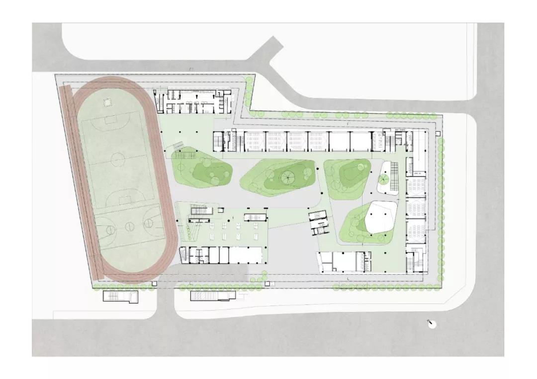 設(shè)計首先從學(xué)校與周邊城市關(guān)系入手,總體布局形成了東西縱向的“教學(xué)辦公+生活運動” 功能模式,動靜分區(qū)明確。設(shè)計將運動場布置在用地西側(cè),有效隔離月亮灣大道城市主干道貨柜車等車行噪音;將風(fēng)雨操場面向南側(cè)港前路且緊鄰運動場布置,方便學(xué)生使用的同時也減少與教學(xué)樓的干擾;主要教學(xué)樓布置在基地安靜的南北兩側(cè),東側(cè)中部布置非正式、半正式的功能教學(xué)空間;教工宿舍、學(xué)生食堂等生活區(qū)布置在西北側(cè),與運動場緊鄰,形成了相對獨立的生活運動區(qū)。